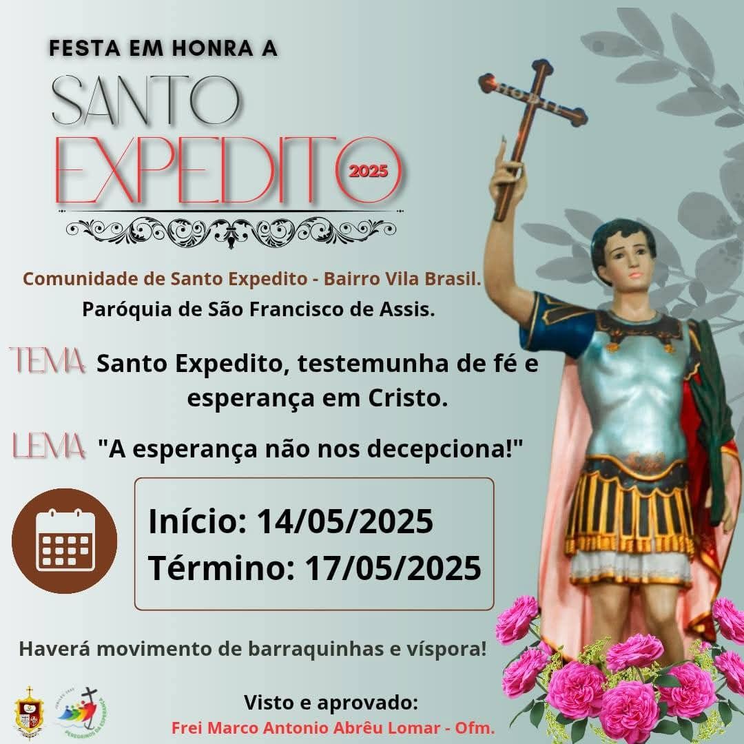 Emprego, saúde, família e casamento, esses são alguns dos pedidos mais recorrentes a Santo Expedito, aclamado nas causas justas e urgentes. Em São João del-Rei, a festa dedicada ao santo tem início nesta quarta-feira, 14, com as orações do tríduo preparatório, na Comunidade dedicada ao santo no Bairro Vila Brasil, pertencente a Paróquia São Francisco de Assis. No sábado, 17, dia maior da festa, haverá missa e procissão.