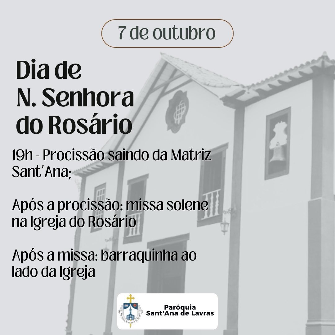 A Paróquia Sant’Ana, em Lavras, realiza nesta segunda-feira, 07, a festa especial em honra a Nossa Senhora do Rosário. Hoje, às 19 horas, vai haver procissão, saindo da Matriz Sant’Ana em direção à Igreja do Rosário. Após a procissão, vai haver Missa Solene e barraquinha ao lado da Igreja, para um grande momento de fé e confraternização.