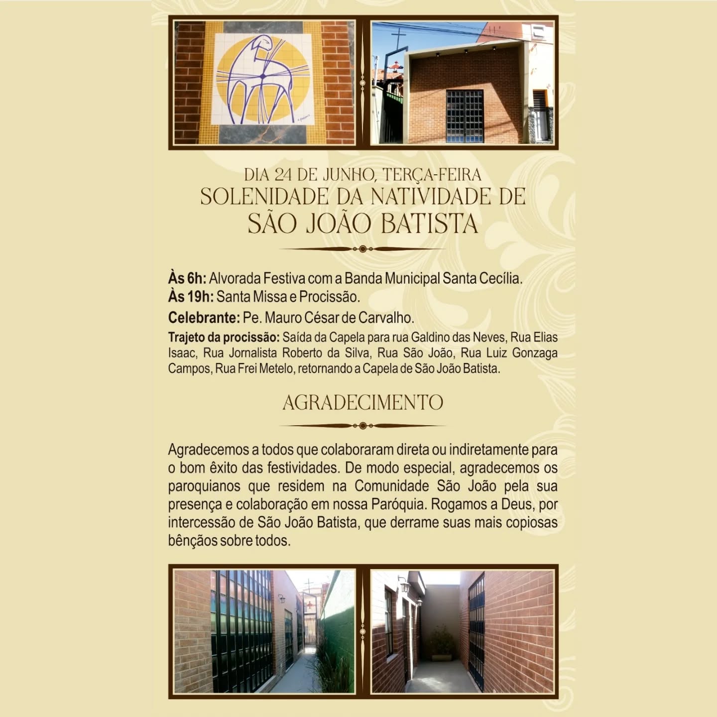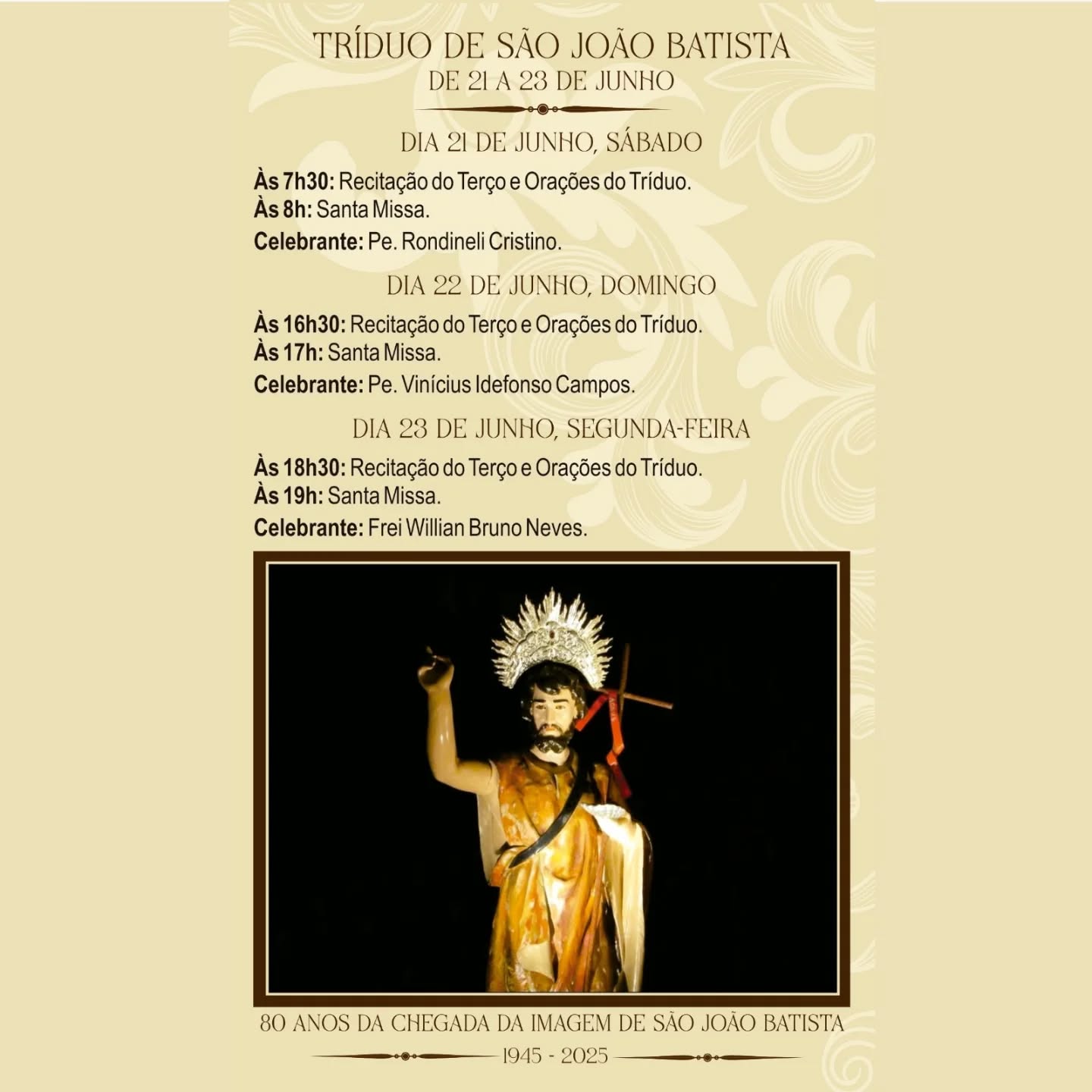 A comunidade ainda segue em festa. Neste sábado, 21, tem início as celebrações do Tríduo Preparatório, com missas, recitações do terço e procissão. Conhecido como João Batista, ele batizou Jesus, seu primo, nas águas do Rio Jordão. Na Igreja, é o único santo comemorado no dia de seu nascimento (24 de junho), pois foi purificado ainda no ventre de sua mãe Isabel, por ocasião da visita da Santíssima Virgem, grávida de Jesus. Os demais santos são celebrados no dia de sua morte, que significa o início da verdadeira vida em Deus.