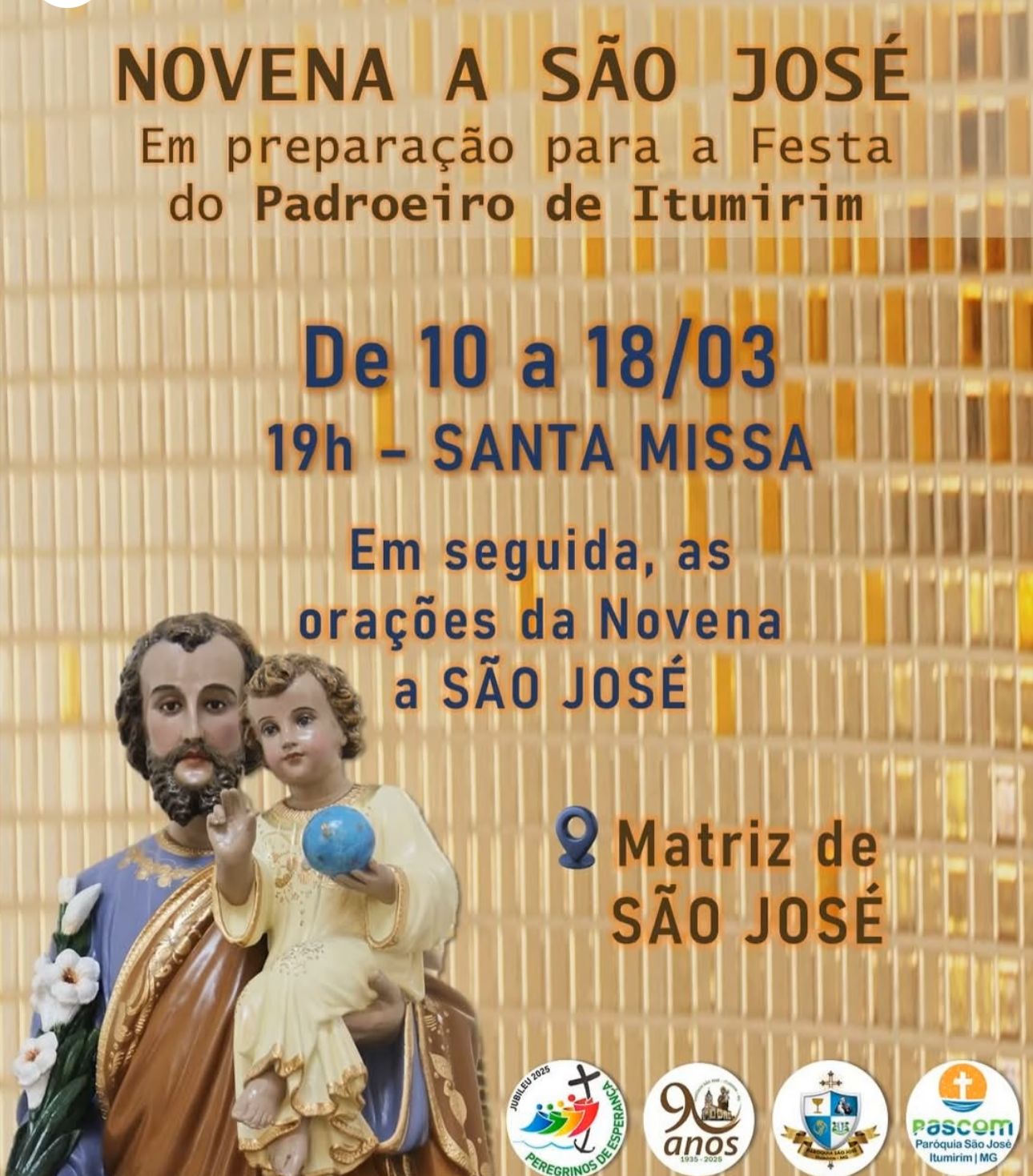 Na terça-feira, 18, encerra-se a novena, e a comunidade segue em espírito festivo e com o coração transbordando de alegria e paz por tantos momentos fortes de oração, escuta da Palavra e, especialmente, pela participação nas Celebrações Eucarísticas. Na quarta-feira, 19, dia do Padroeiro São José, haverá três Missas: 7h, 10h e 19h. Após a Missa das 10h, ao lado da Matriz, será vendido o tradicional bolo de São José, confeccionado pelos voluntários e voluntarias da Paróquia. As festividades serão encerradas com a procissão levando a imagem de São José pelas ruas da cidade.