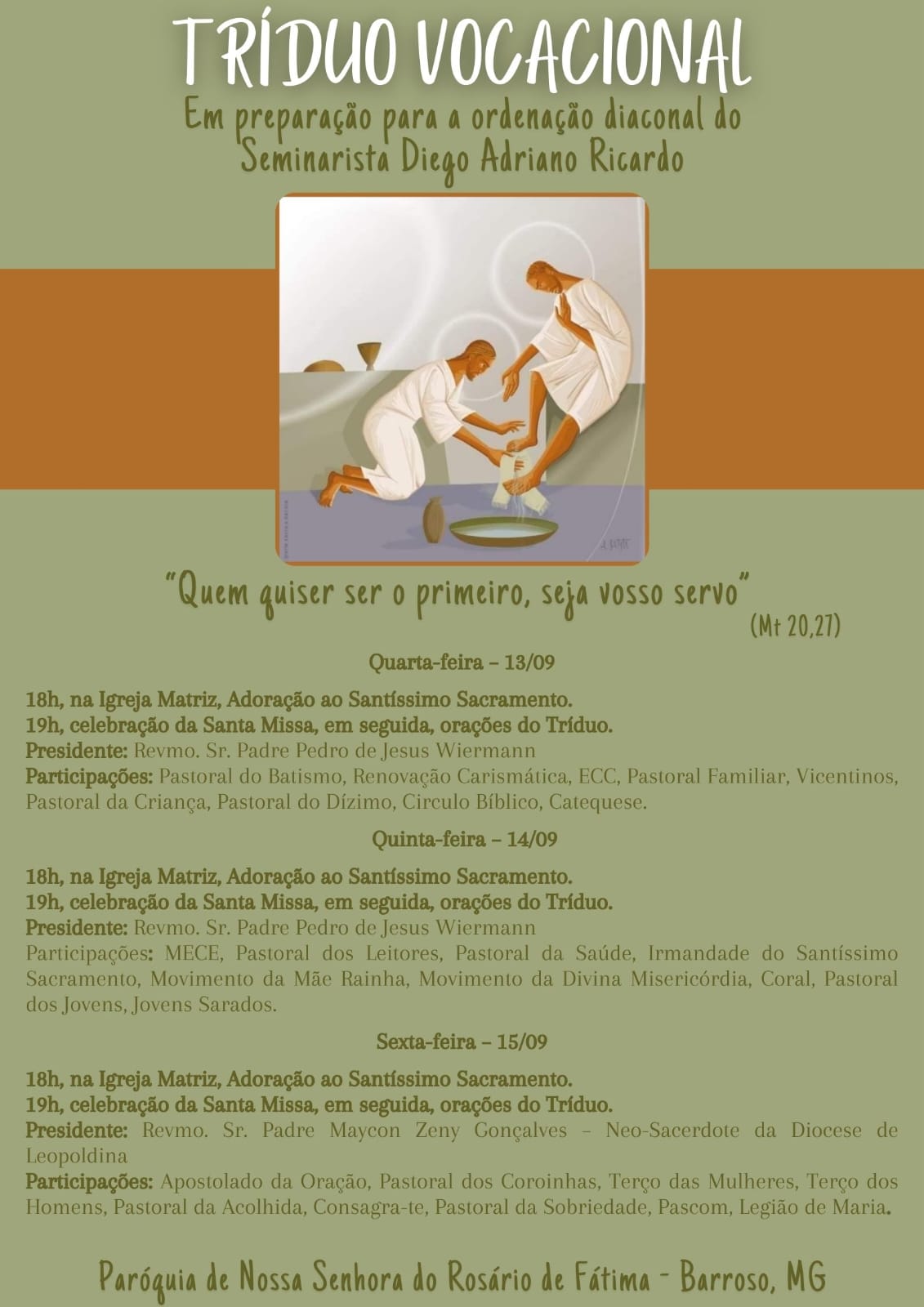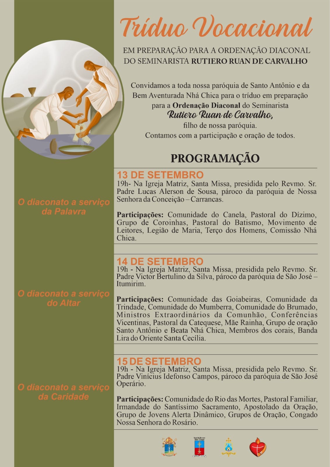 Em clima de festa, as Paróquia Nossa Senhora do Rosário de Fátima, em Barroso, e Paróquia Santo Antônio e Beata Nhá Chica, localizada no Distrito do Rio das Mortes, em São João del-Rei, iniciam nesta quarta-feira, 13, o tríduo preparatório, meditando sobre o ministério diaconal e rezando para que Deus conceda ao jovem um frutuoso exercícios ministerial a serviço do povo de Deus.