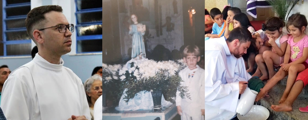 “Acredito que as primeiras fagulhas do chamado para seguir mais de perto à Cristo, por meio do Ministério Ordenado, tenham surgido ainda na infância. Durante a catequese de preparação para a Primeira Eucaristia, aos 10 anos de idade, recebi o convite para ingressar no grupo de coroinhas de minha comunidade, feito por meu catequista, o senhor Vicente Martins. Minha família, sempre atuante na vida de fé da Igreja, jamais impôs obstáculos às minhas escolhas. Pelo contrário, sempre me ouviu com atenção e me aconselhou, incentivando-me a discernir com maturidade. Desde cedo, fui orientado a buscar, antes de tudo, uma decisão livre e convicta, para que minha caminhada fosse marcada pela alegria e pela fidelidade à missão”, explica.