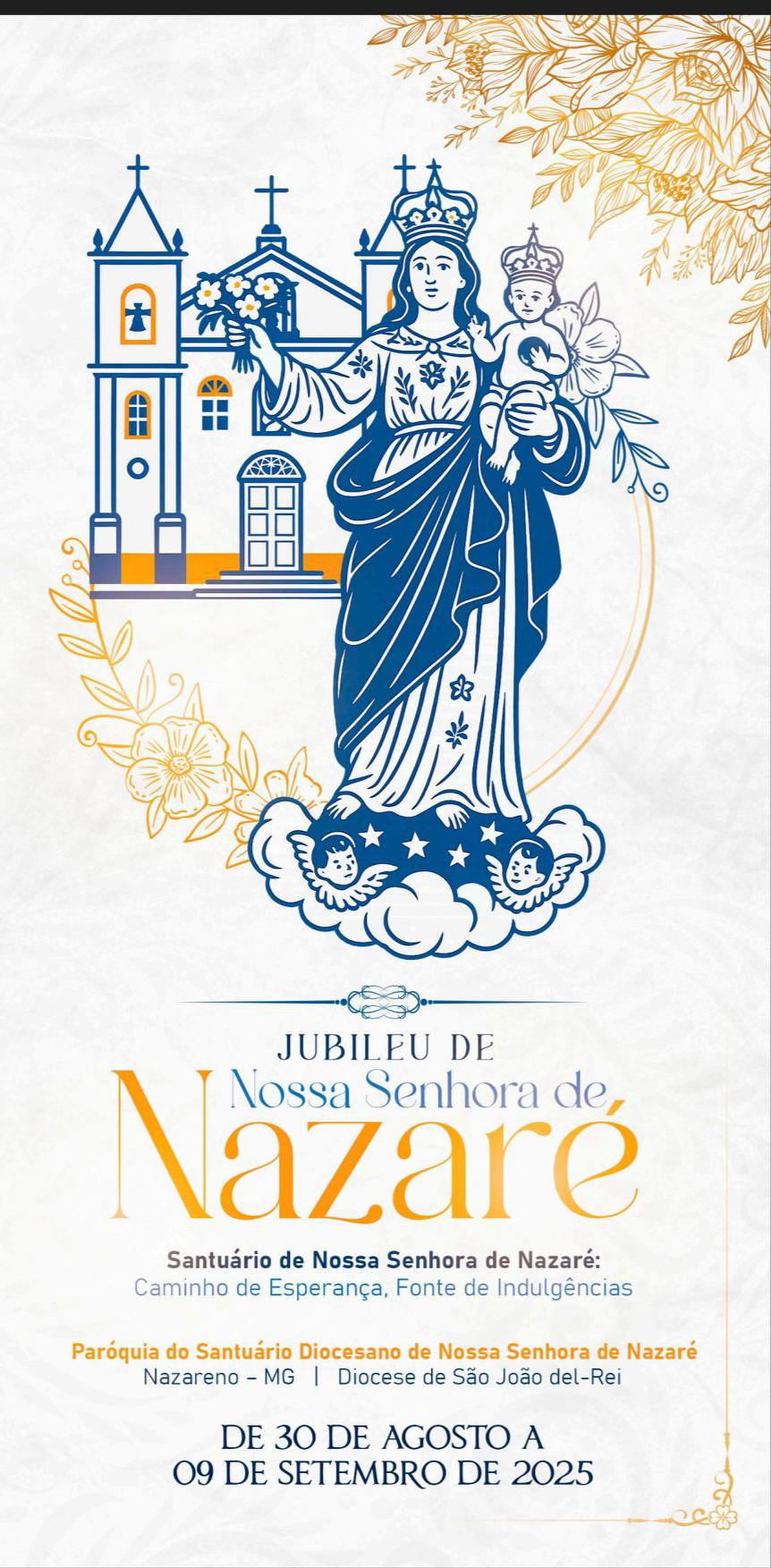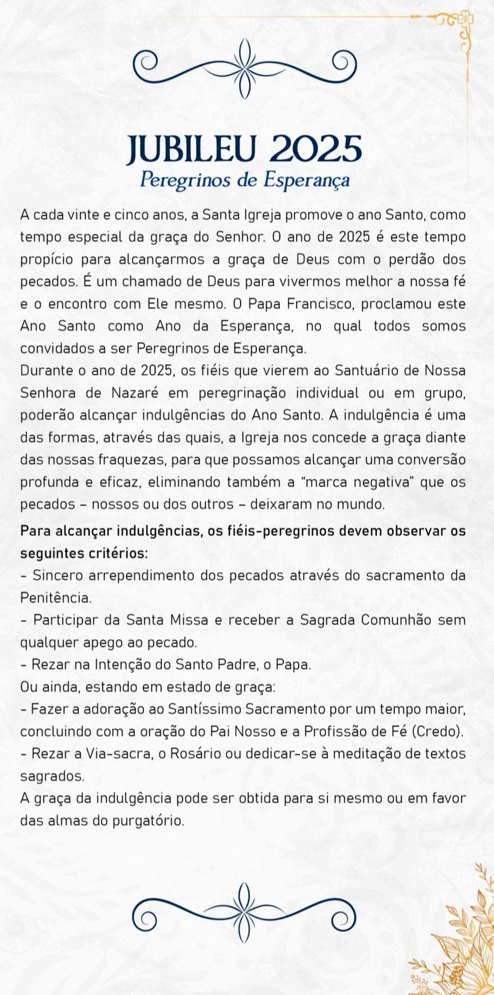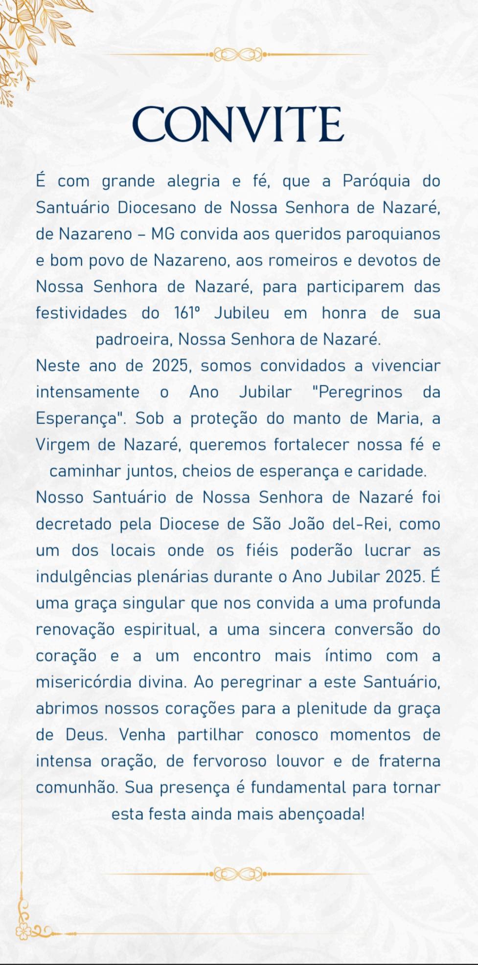 Neste ano de 2025, todos são convidados a vivenciar intensamente o Ano Jubilar “Peregrinos da Esperança”. Sob a proteção do manto de Maria, a Virgem de Nazaré, queremos fortalecer nossa fé e caminhar juntos, cheios de esperança e caridade. O Santuário de Nossa Senhora de Nazaré foi decretado pela Diocese de São João del-Rei como um dos locais onde os fiéis poderão lucrar as indulgências plenárias durante o Ano Jubilar 2025. É uma graça singular que convida a uma profunda renovação espiritual, a uma sincera conversão do coração e a um encontro mais íntimo com al misericórdia divina.