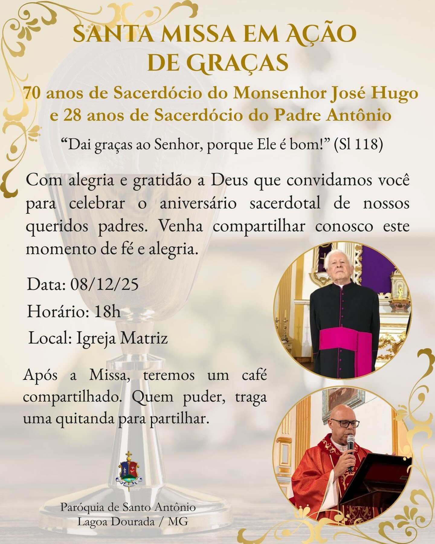 Será em clima de festa que a Paróquia de Santo Antônio, da cidade de Lagoa Dourada, vai celebrar uma Missa em Ação de Graças nesta segunda-feira, 08, na intenção do 70º aniversário sacerdotal do Monsenhor José Hugo. A celebração também vai comemorar os 28 anos de sacerdócio do pároco, Padre Antônio Trindade. Será um momento de louvor, gratidão e oração pelo dom do sacerdócio e pela dedicação pastoral.