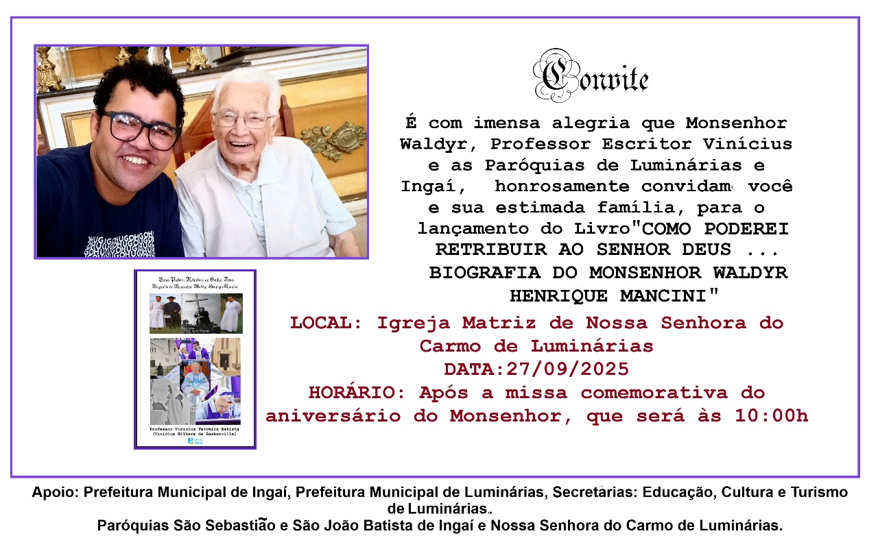 No dia 27 de setembro de 2025, será lançado, na Igreja Matriz de Nossa Senhora do Carmo, na cidade de Luminárias, o livro “Como poderei retribuir ao Senhor Deus”, biografia de Monsenhor Waldyr Henrique Mancini. O lançamento será após a missa comemorativa do aniversário de 97 anos do sacerdote. Monsenhor Waldyr é o decano dos padres do clero da diocese de São João del-Rei, atuando em Luminárias e Ingaí desde fevereiro 1957.