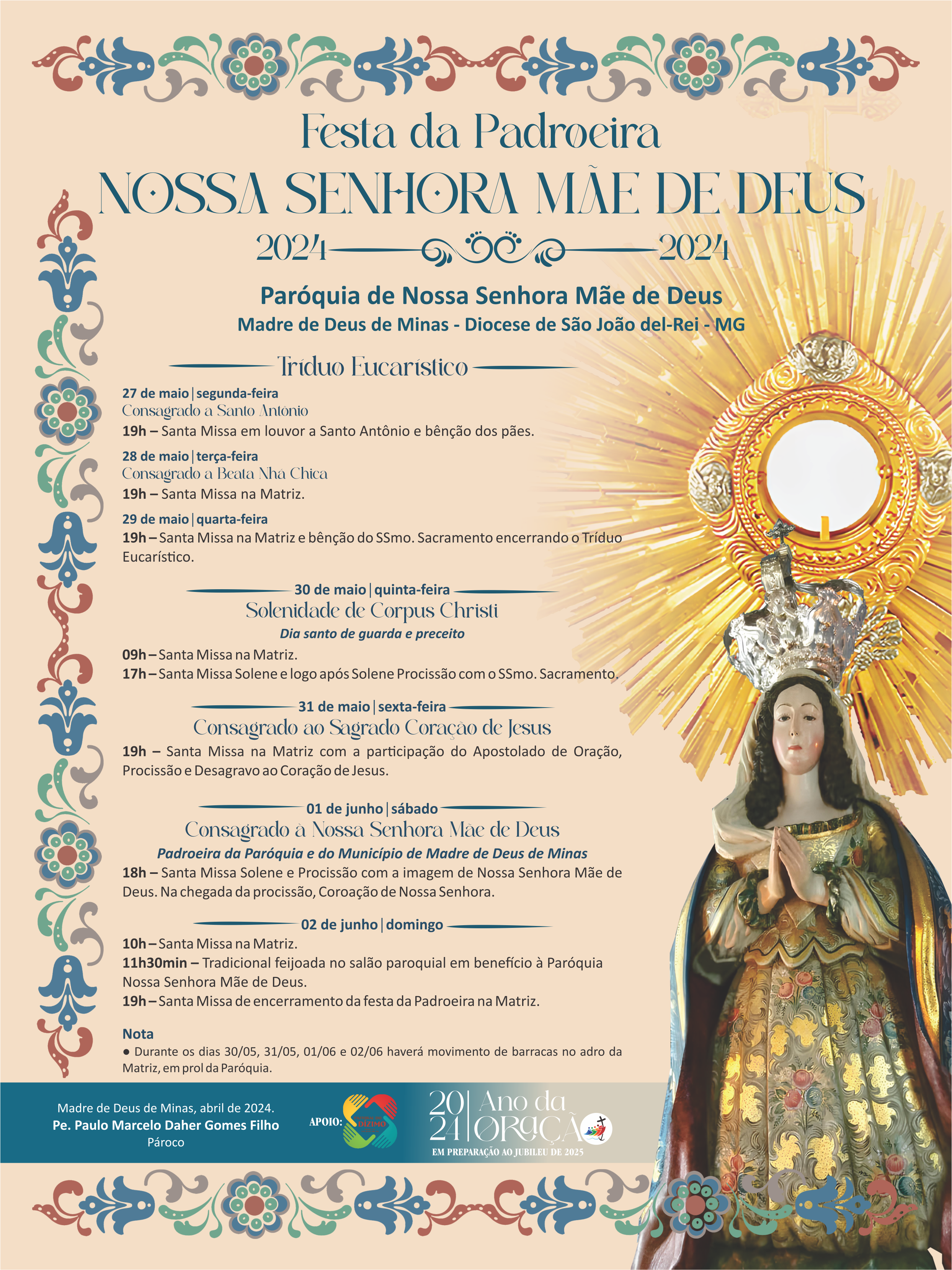 Na cidade de Madre de Deus de Minas, localizada no centro-sul do estado, cerca de 50 km de São João del-Rei, o título devocional mariano já faz parte da vida dos moradores do município de pouco mais de 5 mil habitantes. Pessoas que cultivam a fé e propagam o amor a Virgem Maria desde o nascimento. É com esse amor e devoção que os madredeiense vão festejar a padroeira a partir da próxima segunda-feira, 27. A programação se entrelaçou com a Solenidade de Corpus Christi e, a exemplo do próprio Cristo, os fiéis podem render homenagens a Nossa Senhora.