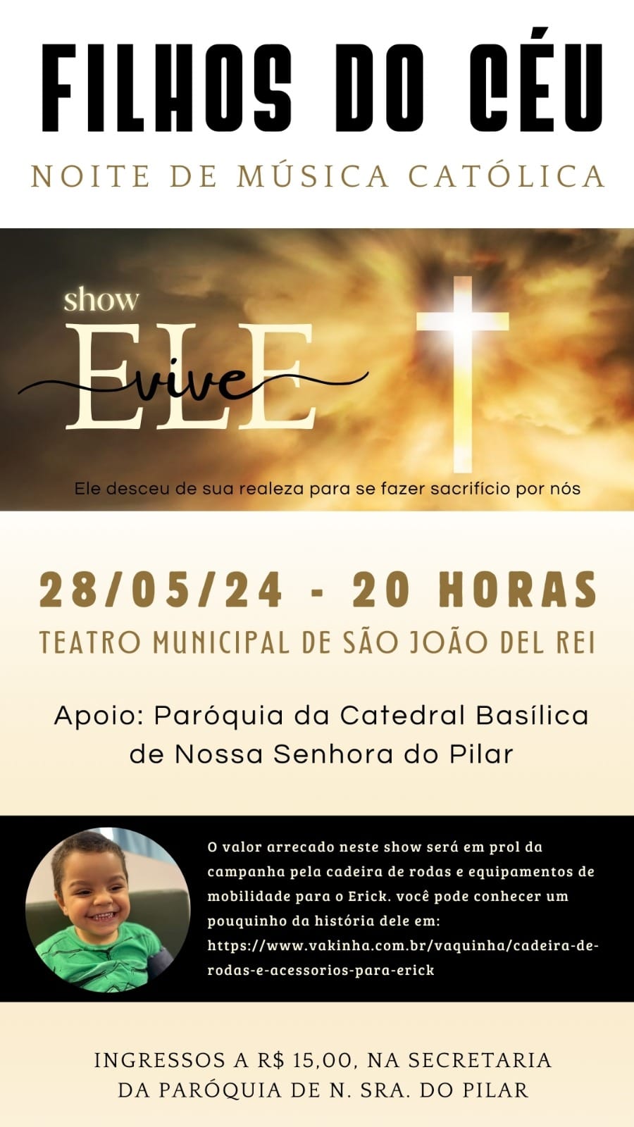 O evento está previsto para as 20 horas e os interessados podem adquirir o ingresso antecipado de forma online (CLIQUE AQUI), no valor de 15,00, ou de forma presencial, na Secretaria da Paróquia da Catedral Basílica Nossa Senhora do Pilar.