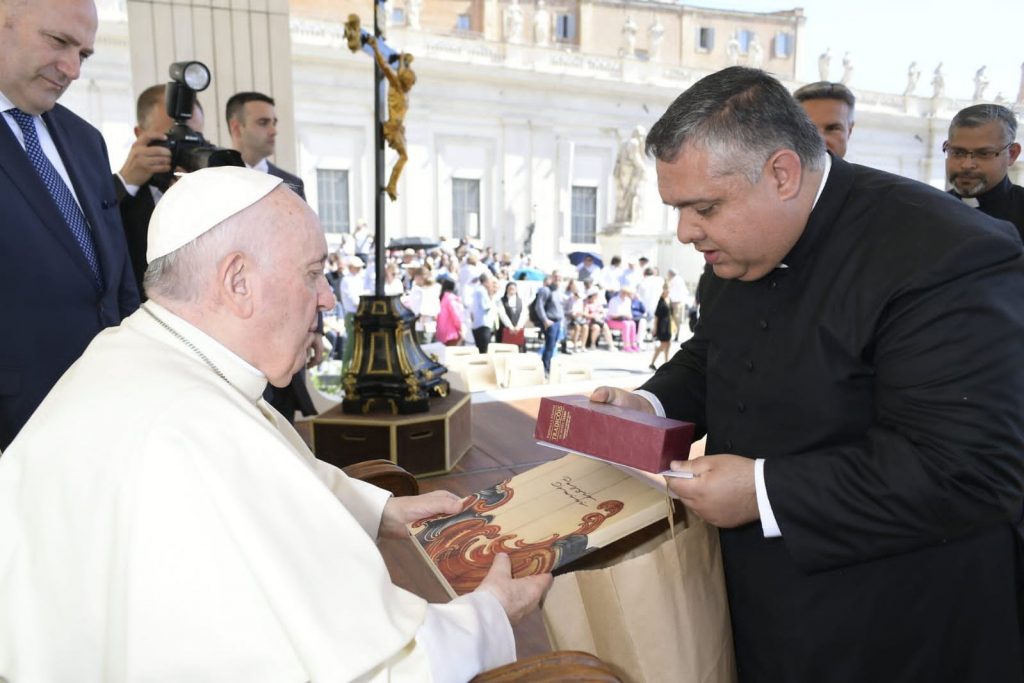 Na ocasião, o sacerdote presenteou o Pontífice com os livros Passio Domini e Piedosas e Solenes Tradições de Nossa Terra, materiais estes que retratam as queridas tradições da paróquia, além de partilhar sobre a comemoração dos 300 anos do início da construção da Catedral.