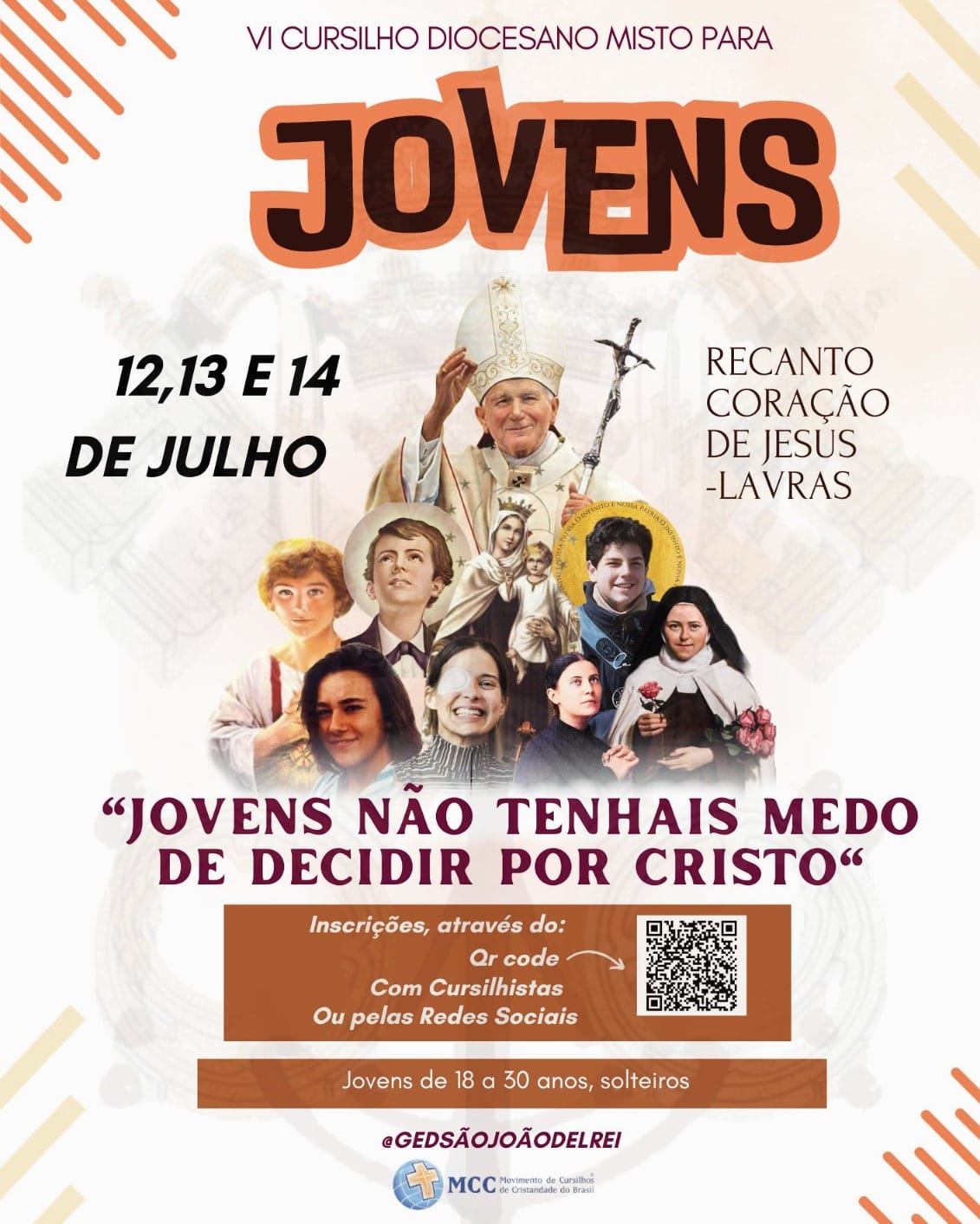Estão abertas as inscrições para o 6º Cursilho Diocesano Misto para jovens, homens e mulheres. O evento vai acontecer entre os dias 12 e 14 de julho, no Recando Sagrado Coração de Jesus, na cidade de Lavras. Os interessados podem preencher a ficha online e contribuir com uma taxa para o custeio da hospedagem e alimentação. É necessário ter a idade entre 18 e 30 anos e ser solteiro.