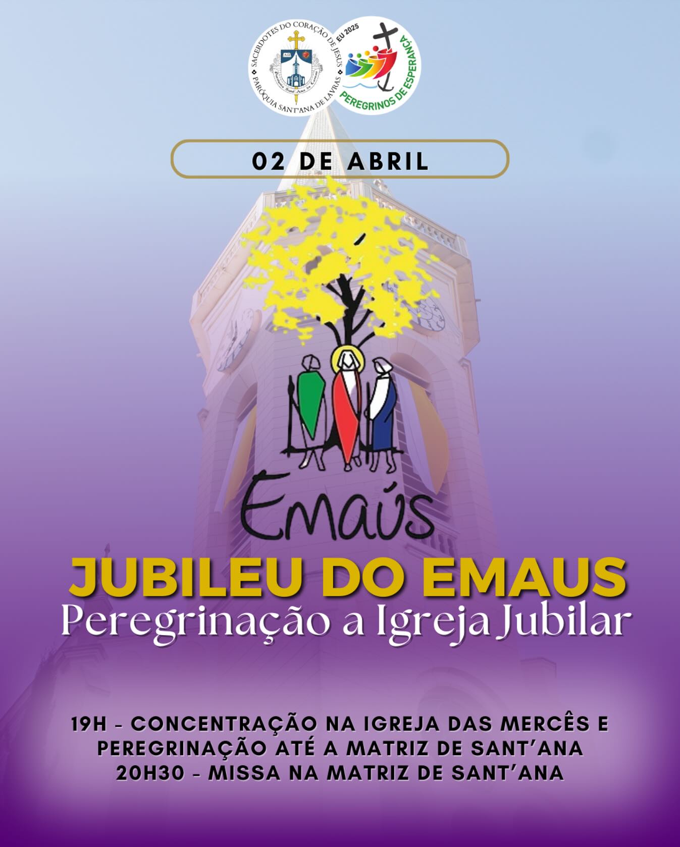 O Movimento de Emaús vai fazer na próxima quinta-feira, 02, sua peregrinação jubilar na Matriz de Sant’Ana, em Lavras. A programação conta com concentração às 19 horas na Igreja das Mercês rumo à Matriz de Sant’Ana, Igreja Jubilar, onde será celebrada a Santa Missa às 20h30.