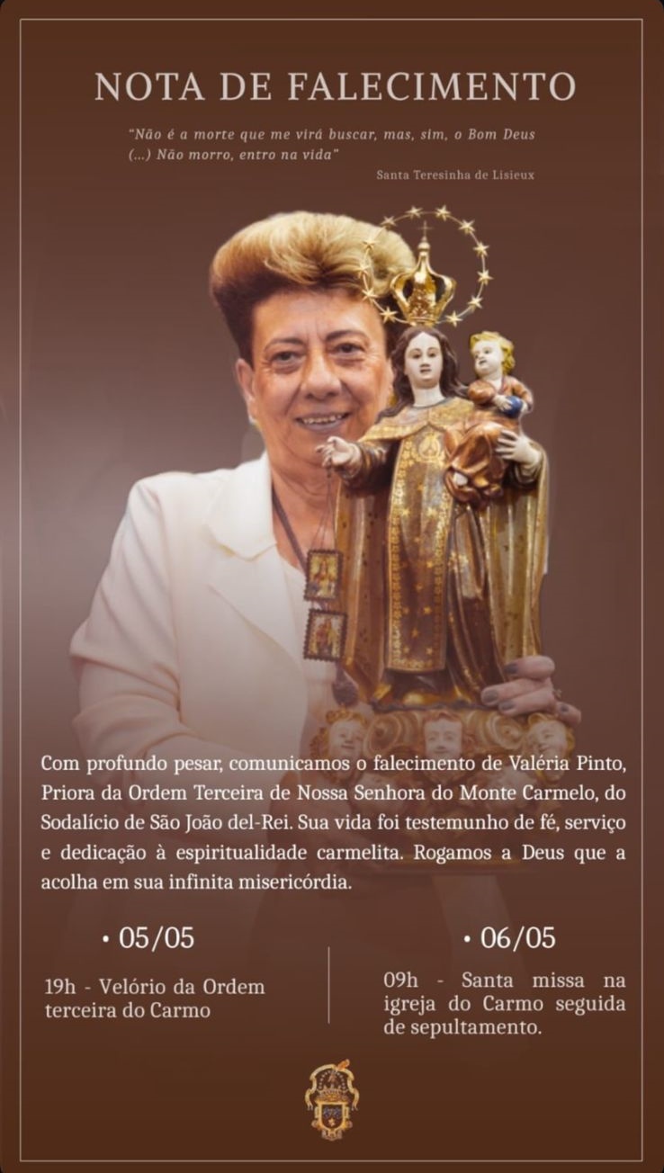 Com profundo pesar, comunicamos o falecimento de Valéria Maria Pinto, Priora da Ordem Terceira de Nossa Senhora do Monte Carmelo, do Sodalício de São João del-Rei. Sua vida foi testemunho de fé, serviço e dedicação à espiritualidade carmelita. Seu sepultamento será nesta terça-feira, 06 de maio, após a celebração da Santa Missa às 09 horas, na igreja de Nossa Senhora do Carmo.