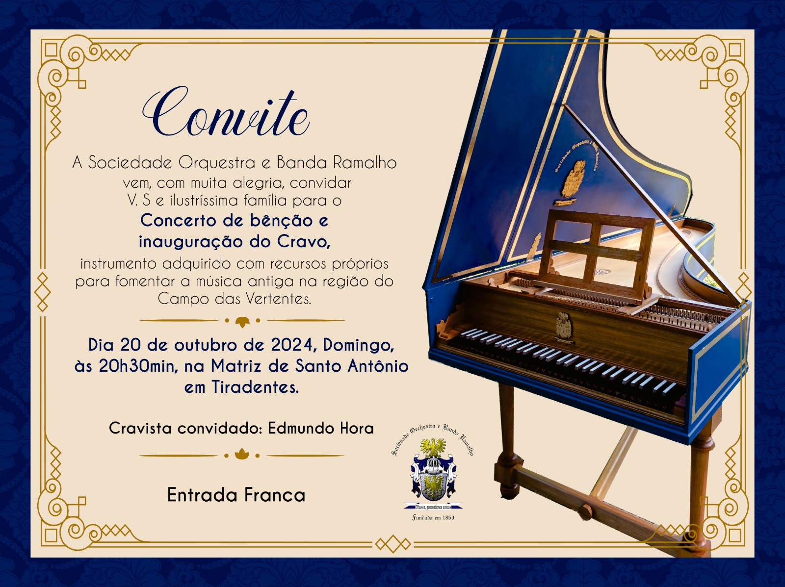A sociedade Orquestra e Banda Ramalho, fundada em 1860 em Tiradentes, vai realizar neste domingo, 20, o Conserto de Bênção e inauguração do cravo, instrumento adquirido para fomentar a música antiga na região do Campo das Vertendes. A celebração vai acontecer às 20h30, na Matriz de Santo Antônio. A entrada é franca.