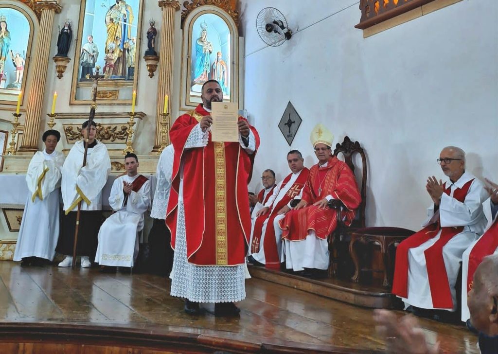 Após a leitura da provisão canônica e assinada pelo Chanceler do Bispado, Padre Alisson André Sacramento, Padre Victor fez a profissão de fé e, tocando o Evangelho, fez seu juramento de fidelidade. Seguindo os tradicionais ritos, o sacerdote recebeu a chave da igreja, juntamente com alguns outros símbolos importantes para a caminhada pastoral como a chave do sacrário, a concha do batismo e a estola roxa, representando o Sacramento da Penitência.