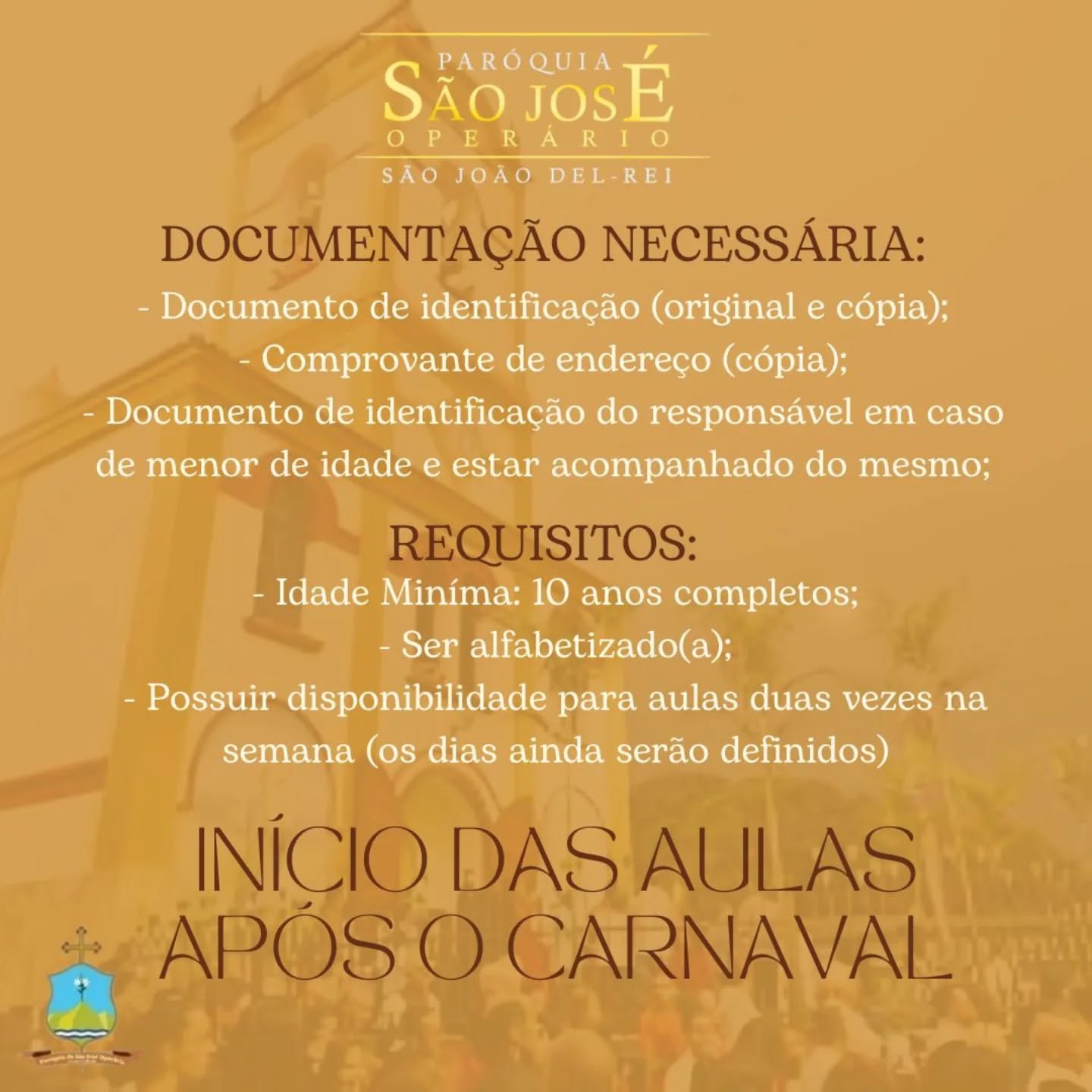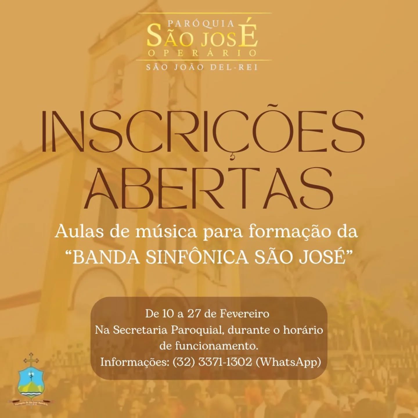 Os interessados podem se inscrever até o dia 27 de fevereiro na secretaria paroquia, no horário de expediente. Informações pelo (32) 3371-1302.