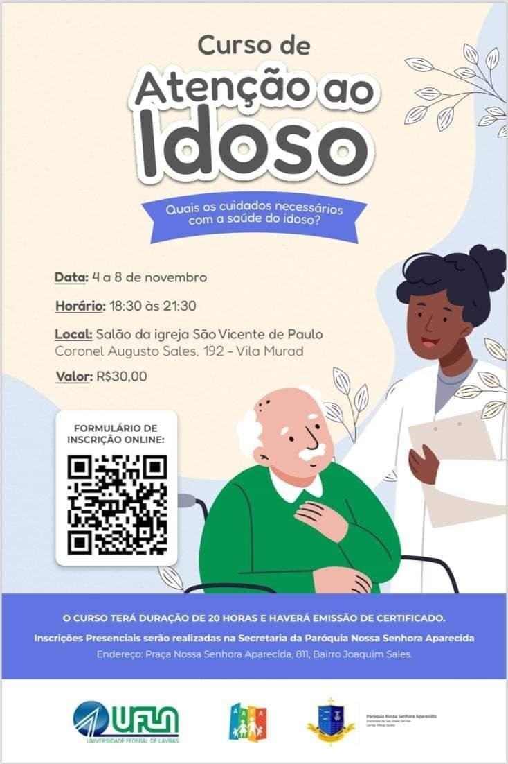 Após a realização do curso de extensão voltado para a área de atenção aos idosos e os cuidados necessários com saúde do idoso, no mês de outubro, a grande aceitação e procura por parte da comunidade, a Paróquia Nossa Senhora Aparecida, da cidade de Lavras, através da Associação de Amparo às Famílias (AAFA), vai abrir uma nova turma, com aulas de 04 à 08 de novembro.