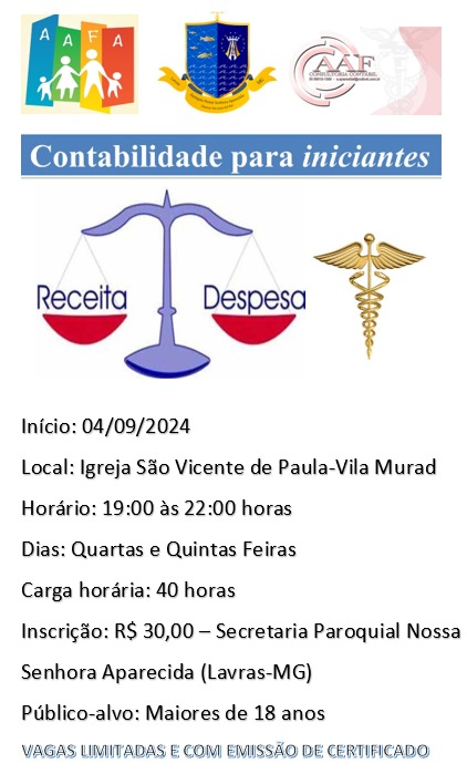 Com o objetivo de apresentar noções básicas da Contabilidade Empresarial e proporcionar novas possibilidades no mercado de trabalho, a Paróquia Nossa Senhora Aparecida, através da Associação de Amparo às Famílias (AAFA), deu início ao curso de Contabilidade para iniciantes. este curso revela-se útil para diversos profissionais, como analistas, investidores, administradores e todos que desejam entender como é feita a contabilidade e porque ela é tão importante para a gestão de uma empresa, independentemente do seu tamanho.