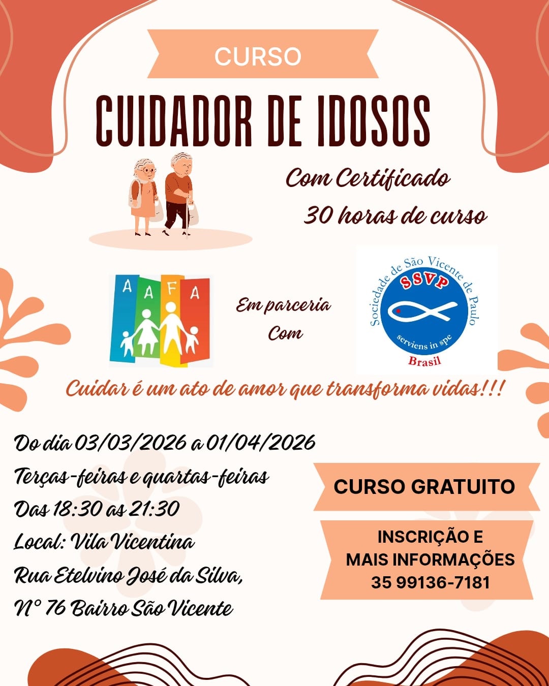 O cuidado com a terceira idade é uma das áreas que mais tem crescido nos últimos anos. Cada vez mais pessoas estão buscando o curso de cuidador de idoso para se especializar e atender às demandas desse público e garantir que os idosos tenham uma vida mais saudável e segura. É pensando nisso que a Paróquia Nossa Senhora Aparecida, da cidade de Lavras, através da Associação de Amparo às Famílias (AAFA), em parceria com a Sociedade São Vicente de Paulo, promove a partir do dia 03 de março uma capacitação para cuidadores de idosos. O curso tem a duração de 30 horas e conta com emissão de certificado.