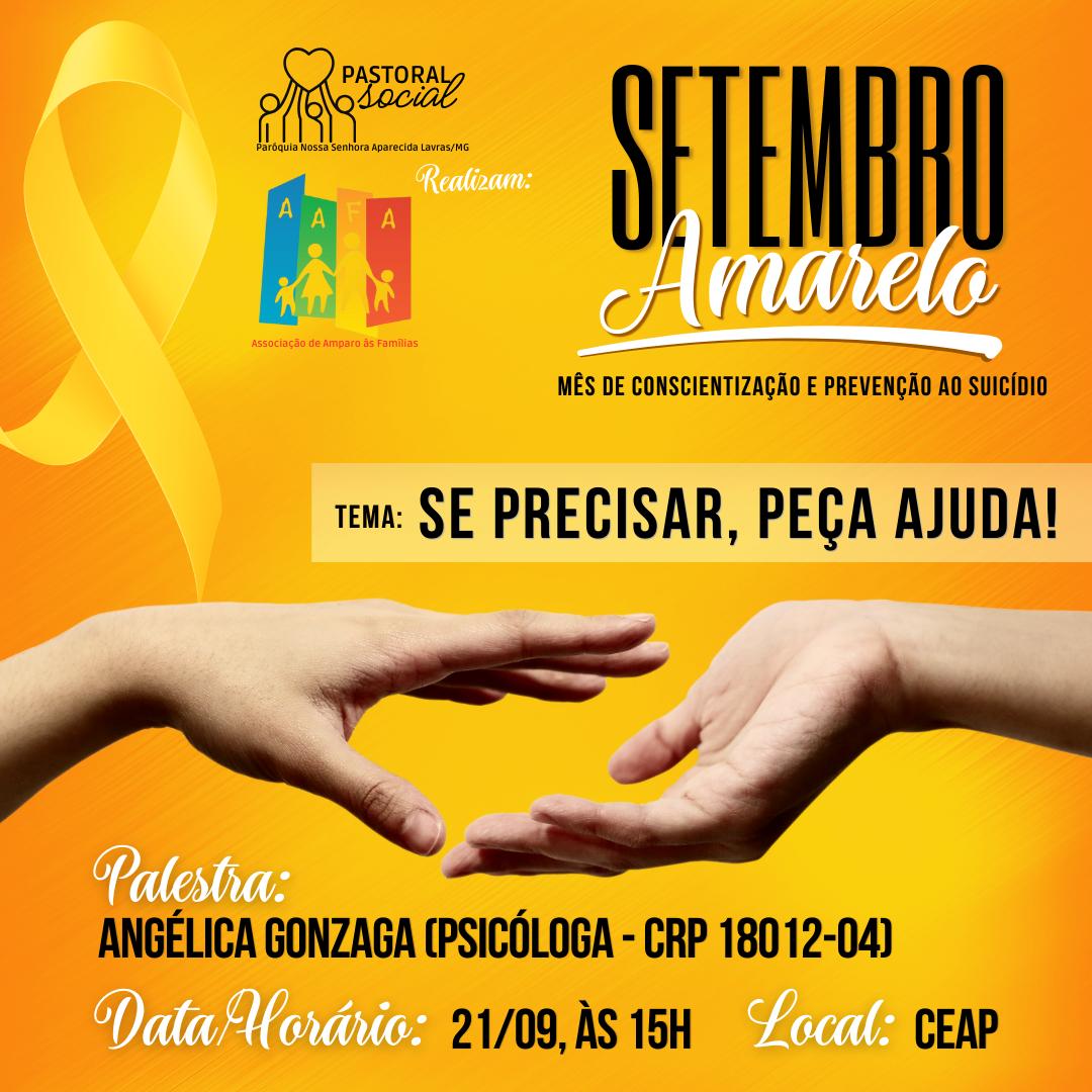 Com o objetivo de contribuir para a conscientização sobre a importância da prevenção ao suicídio, a Paróquia Nossa Senhora Aparecida, da cidade de Lavras, através da Pastoral Social e da Associação de Amparo as Famílias (AAFA), uma palestra em sintonia com a Campanha Setembro Amarelo. O evento vai acontecer neste sábado, 21, às 15 horas, na CEAP e vai contar com a presença da psicóloga Angélica Gonzaga que vai trabalhar a temática “Se precisar, peça ajuda”.