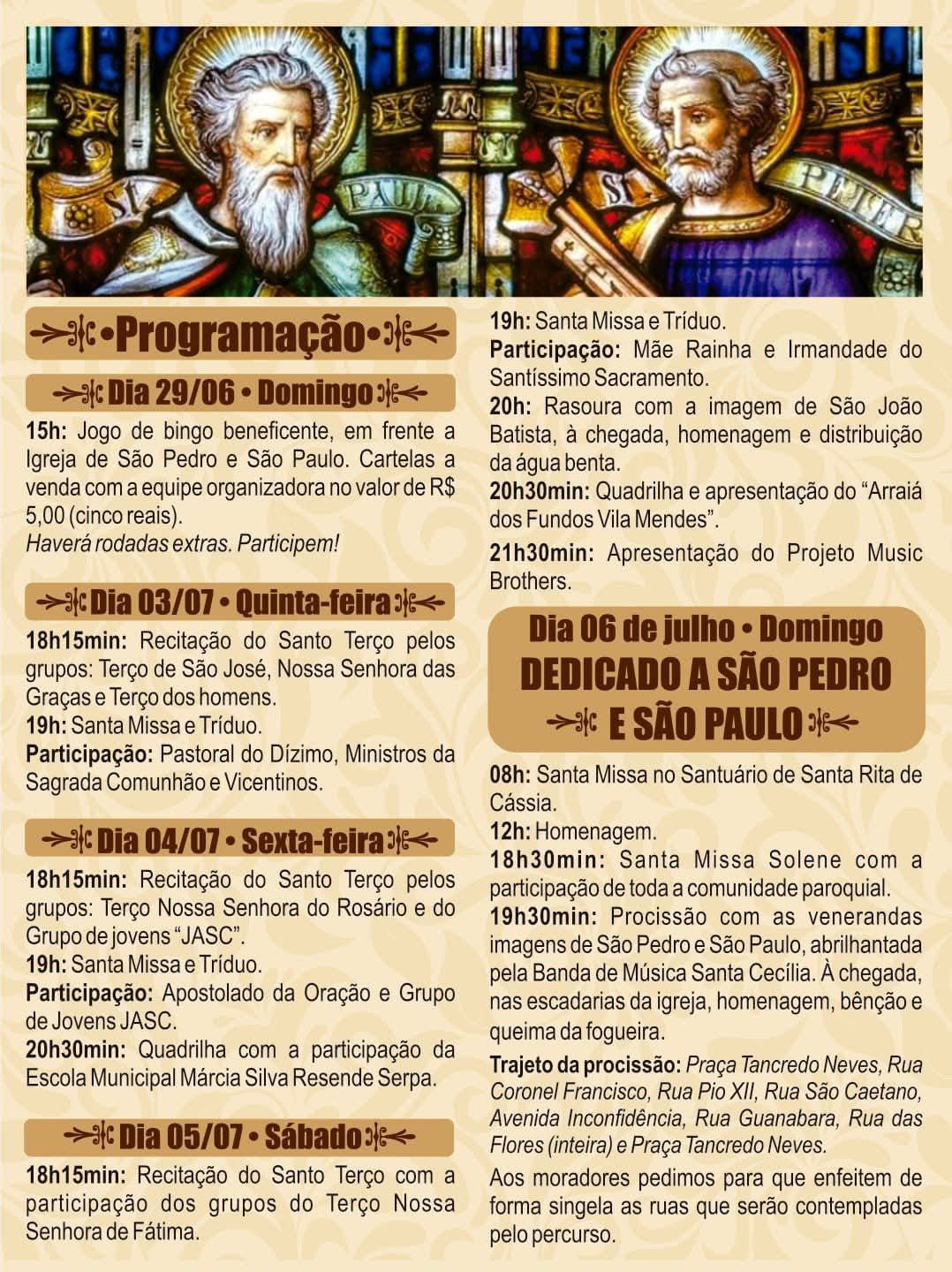 Segundo o pároco, Padre Geraldo Sérgio França, o coração da comunidade católica, apostólica, romana, una e santa, se enche de alegria por celebrar a Solenidade dos apóstolos e mártires, São Pedro e São Paulo. “O Senhor nos concede a alegria de festejar os apóstolos e mártires São Pedro e São Paulo. Pedro, o primeiro a confessar a fé em Cristo, fundou a Igreja primitiva sobre a herança de Israel. Paulo, mestre e doutor da fé, iluminou as profundezas do mistério e anunciou o Evangelho a todas as nações. Assim, por diferentes meios, os dois congregaram a única família de Cristo e, unidos pela coroa do martírio, recebem hoje, por toda a terra, a mesma veneração. Que nossa comunidade paroquial na “fome da palavra de Deus” (cf. Am 8,11) sob a direção do Espírito Santo, em comunhão com o Santo Padre, o Papa Leão XIV, leve o povo da nova aliança à perfeita unidade da Igreja“, pontuou o sacerdote no encarte da programação.
