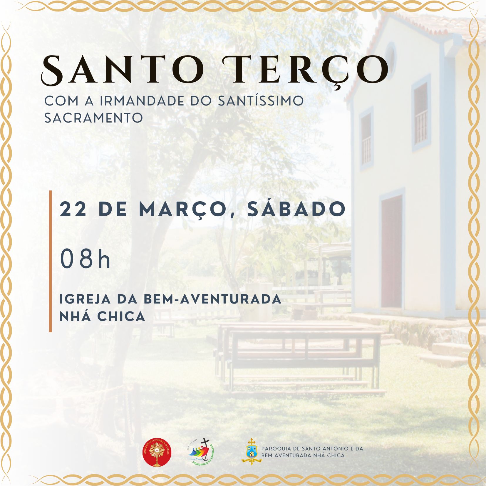 A Paróquia Santo Antônio e Beata Nhá Chica, localizada no Distrito do Rio das Mortes, vai realizar no próximo sábado, dia 22 de março, a Oração do Terço na Igreja da Bem-Aventurada. O momento de oração vai ter início às 8 horas da manhã e é aberta a todos os paroquianos e devotos de Nhá Chica, além da Irmandade do Santíssimo Sacramento da Paróquia.