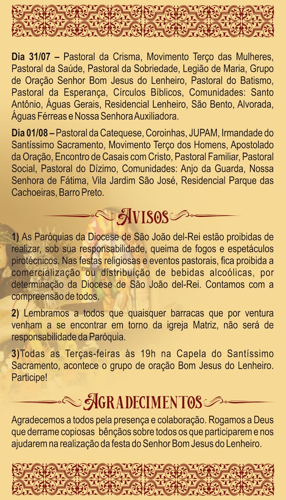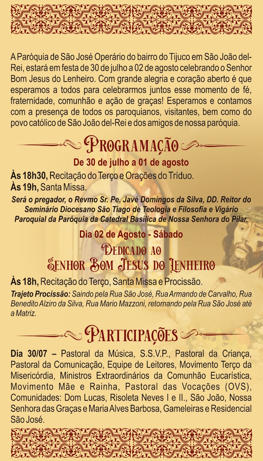 Das muitas festas dedicadas ao Bom Jesus com seus vários títulos, a festa do Senhor do Lenheiro vem se tornando cada vez mais abrangente e participativa no calendário da Paróquia de São José Operário, no bairro do Tijuco, em São João del-Rei. Neste ano a festa vai ter início no dia 30 de julho e segue até o domingo, dia 02.