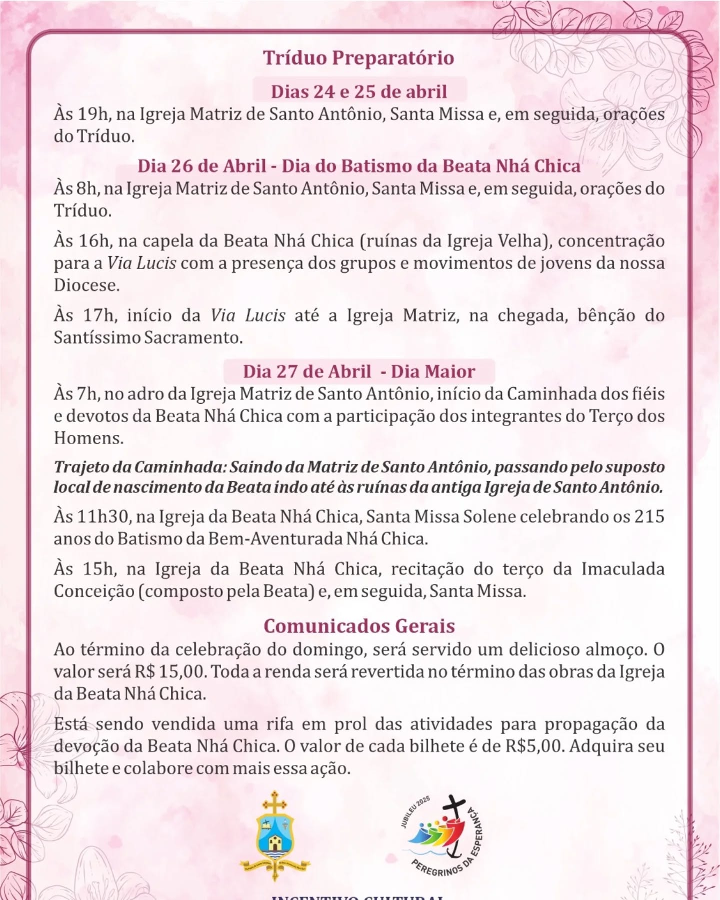 Desde a última quinta-feira, 24, a Paróquia de Santo Antônio e da Bem-Aventurada Nhá Chica vem realizando junto da comunidade a celebração da Santa Missa e tríduo preparatório. No sábado, 26, uma programação especial será realizada, com missa pela manhã e caminhada da Via Lucis, saindo das ruinas da “igreja Velha”.