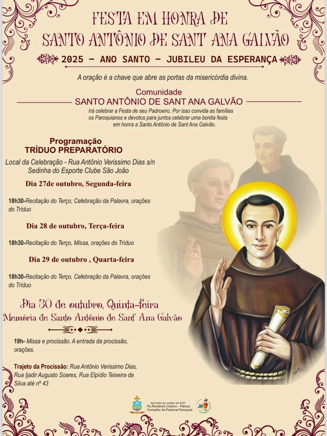 A Igreja celebrou no último sábado, 25, a memória do Santo Franciscano, Antônio de Sant’Ana Galvão (Frei Galvão), conhecido como “o homem da paz e da caridade” e pelas suas “Pílulas Milagrosas”. Foi o primeiro santo brasileiro que nasceu, viveu e morreu no Brasil, canonizado em maio de 2007. Em São João del-Rei, a programação comemorativa se concentra na Paróquia São José Operário e conta com recitação do terço, Celebração da Palavra, Missa e procissão.