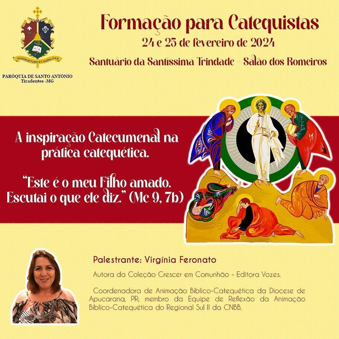 A Paróquia Santo Antônio, da cidade de Tiradentes, vai promover nos dias 24 e 25 de fevereiro, no Santuário da Santíssima Trindade (Salão dos Romeiros), uma formação para catequistas. A inspiração catecumenal na prática catequética será o tema central do evento.