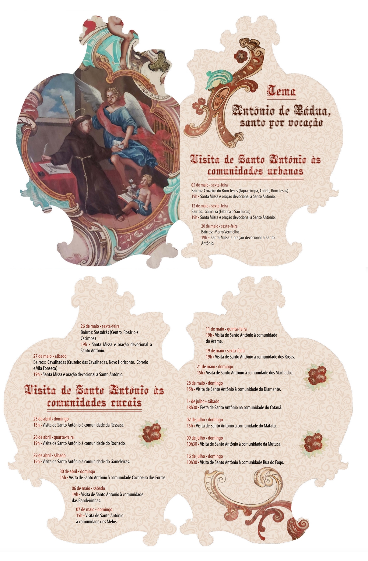 A programação na Paróquia teve início no último domingo, dia 23, e segue até julho. “A celebração da festa do Padroeiro é um momento de forte união e de espírito paroquial, em que somos convidados a praticar e testemunhar a porção da Igreja de Cristo que somos enquanto reunidos em comunidade. Nesse sentido, celebremos com júbilo ne peçamos a ele a graça de semearmos entre nós a os frutos de uma verdadeira paz, que provém do Senhor”, pontuou o pároco, padre Adriano Tercio melo de Oliveira.