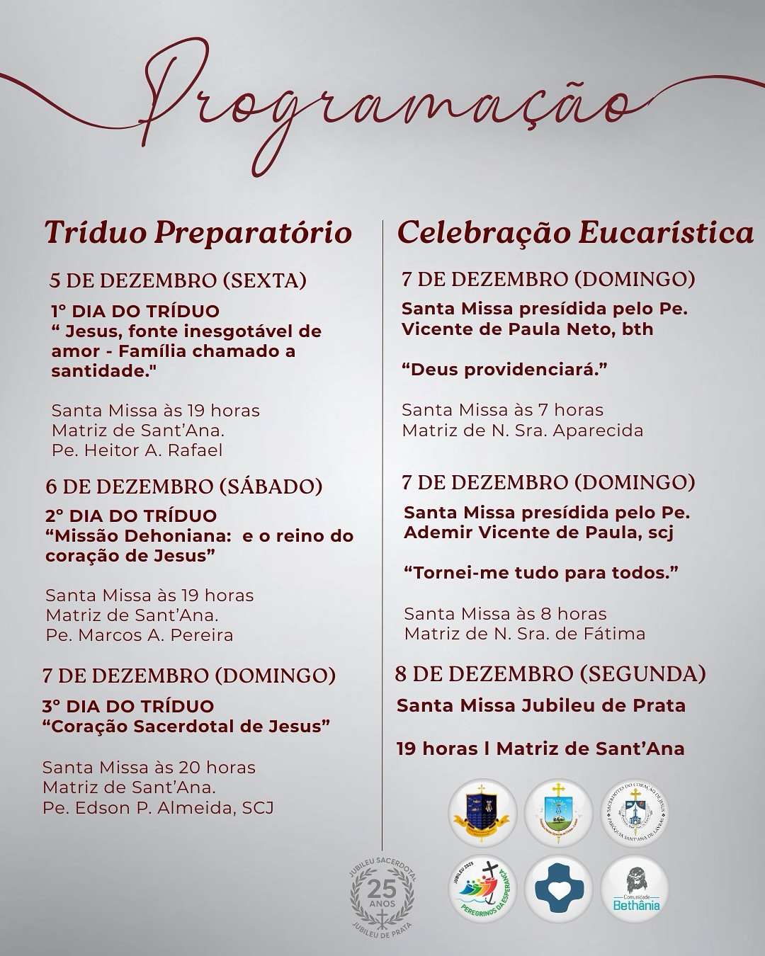 A Paróquia Sant’Ana, da cidade de Lavras, inicia nesta sexta-feira, 05, o Tríduo Preparatório em celebração do Jubileu de Prata Sacerdotal dos padres Ademir Vicente de Paula, scj; Joaquim Donizete Tomba, scj; e Vicente de Paula Neto, bth. A programação segue em clima de festa até segunda-feira, 08, quando vai acontecer a Santa Missa festiva às 19 horas.