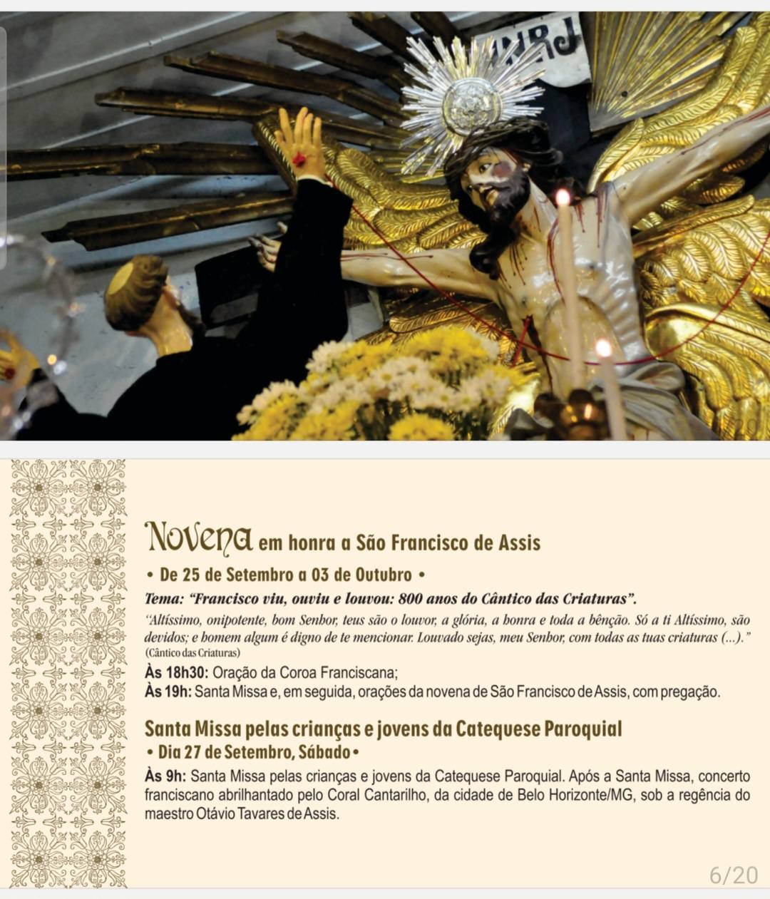 Começa nesta quinta-feira, 25, na Paróquia São Francisco, em São João del-Rei, a novena em honra a São Francisco de Assis. Este ano a festa tem como tema “Francisco viu, ouviu e louvou: 800 anos do Cântico das Criaturas”.