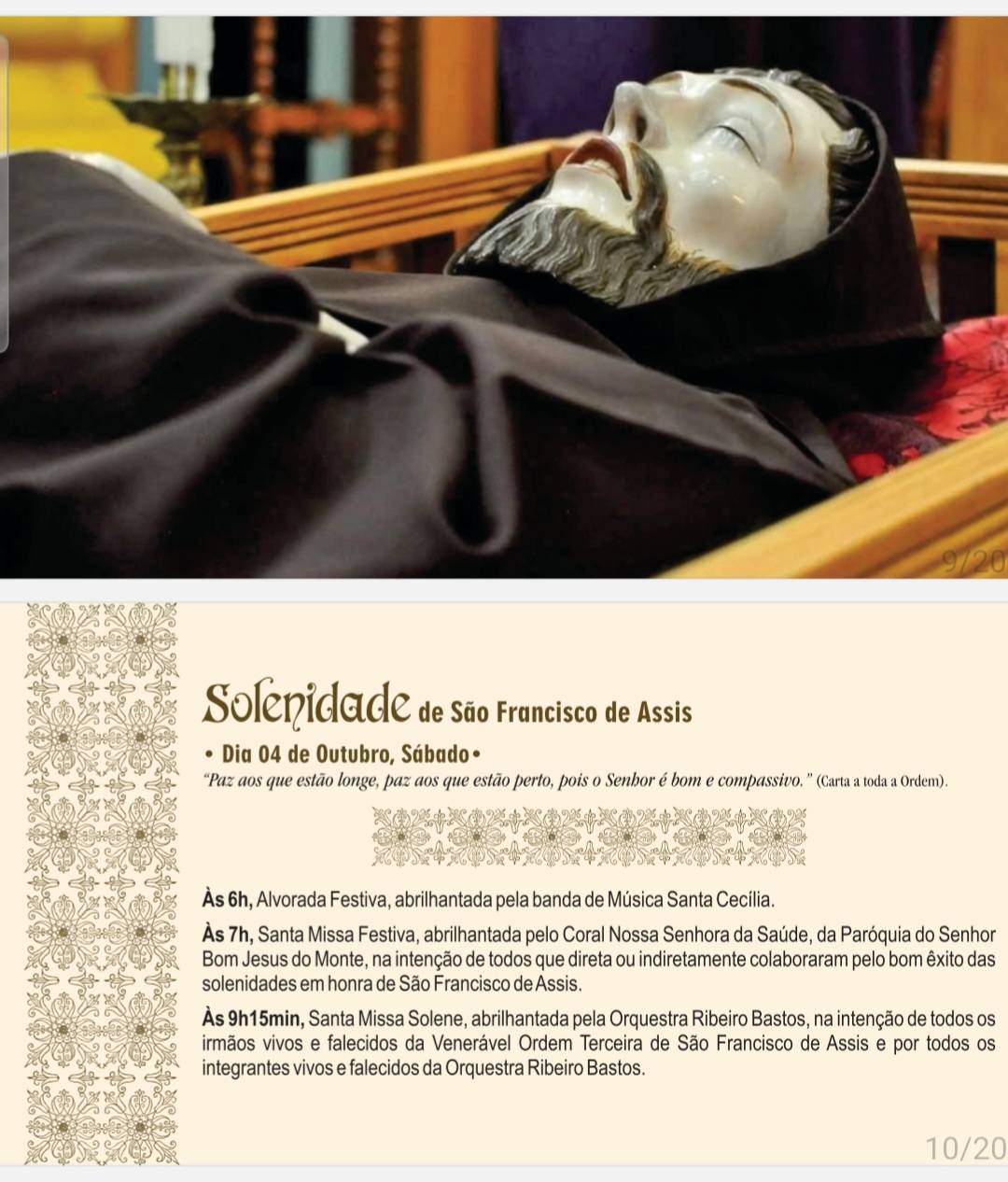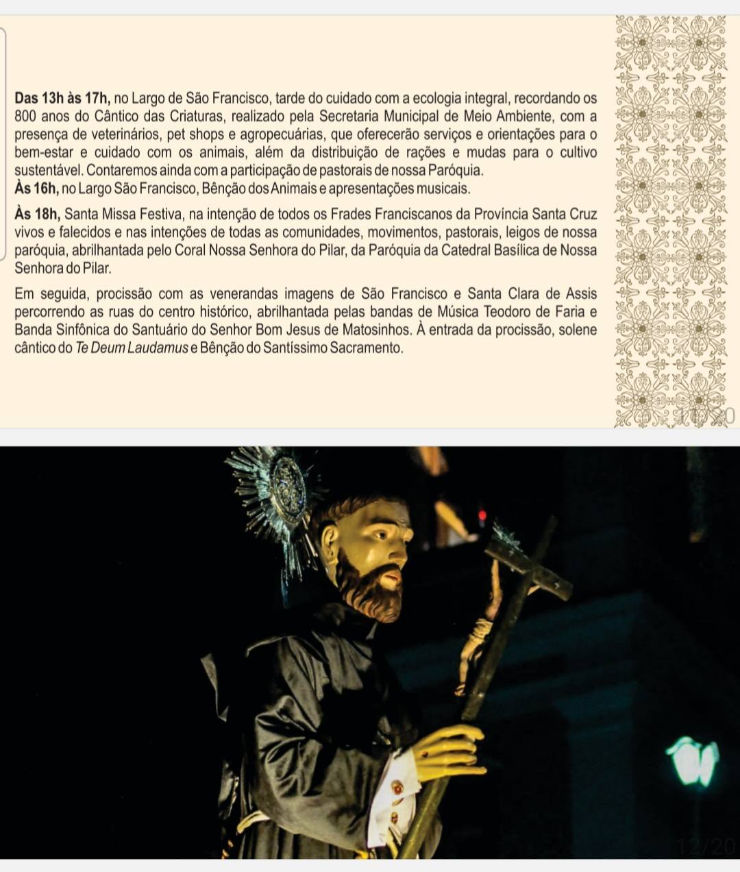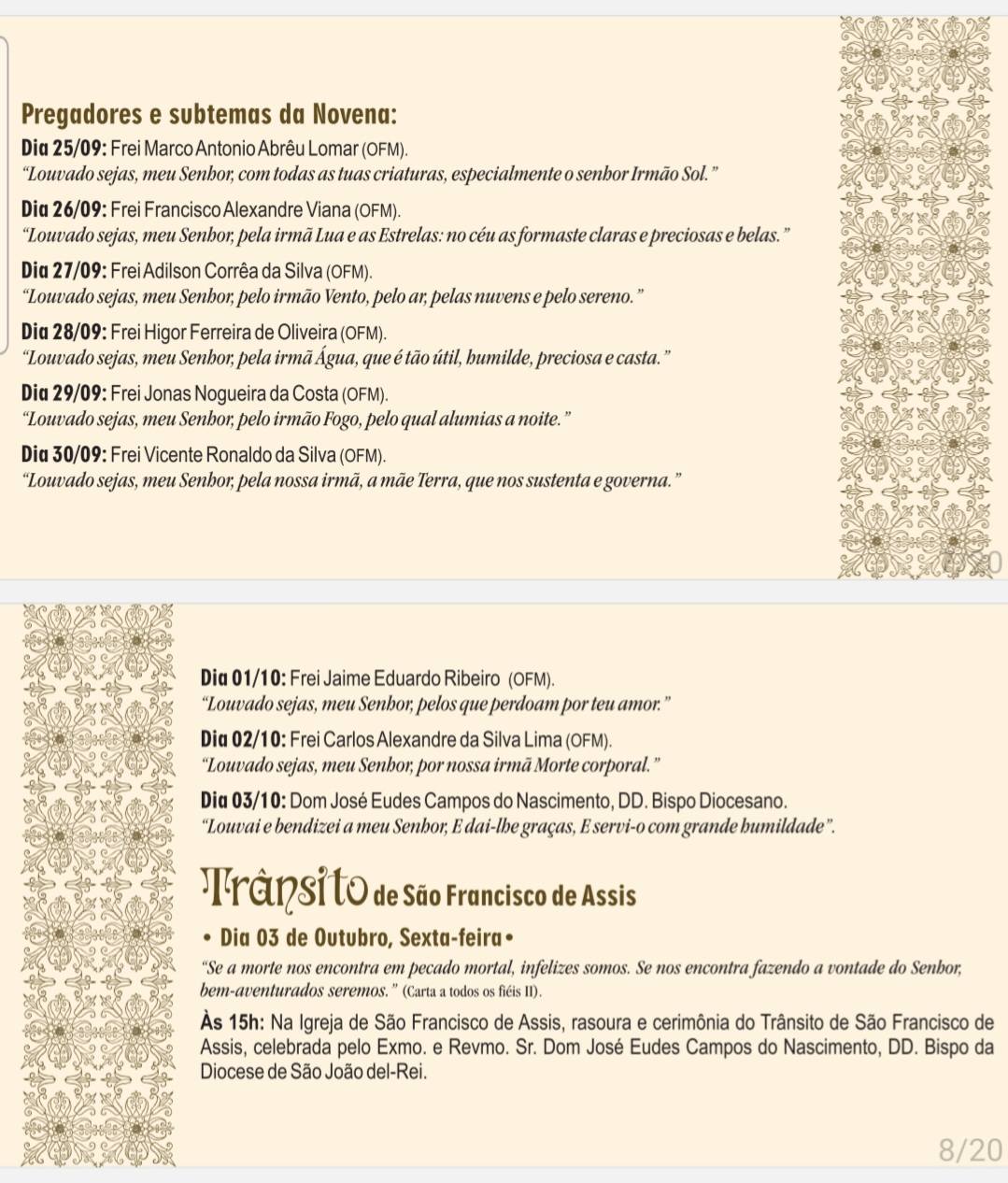 Até o dia 03 de outubro vai haver oração da coroa franciscana às 18h30, seguida de missa e novena. No dia 03, às 15 horas, vai acontecer a Celebração do Trânsito de São Francisco, recordando o encontro do santo com a “Irmã Morte” e a passagem para a Vida eterna. A celebração vai acontecer na Igreja de São Francisco de Assis, com rasoura e cerimônia do trânsito. O dia consagrado à São Francisco de Assis acontece na sexta-feira, 04 de outubro, com programação especial.