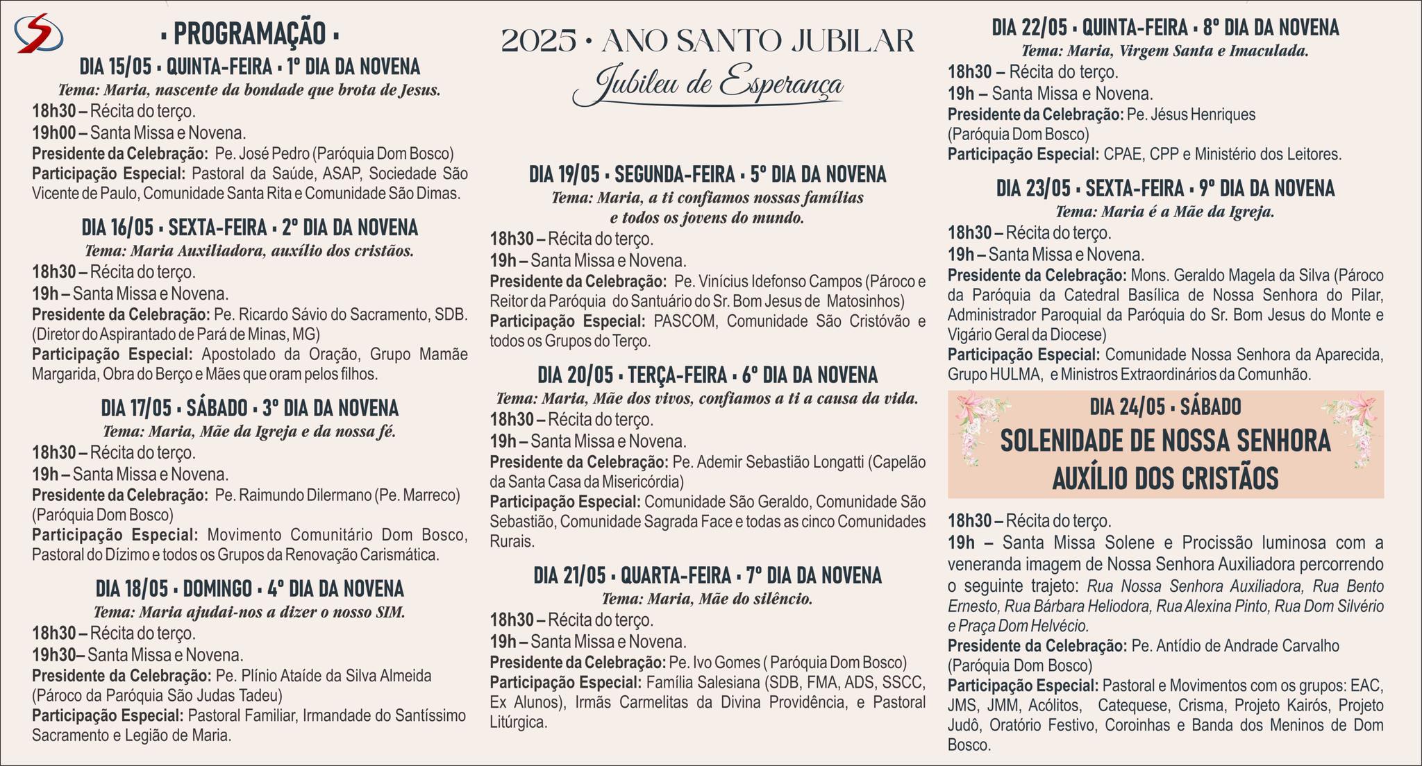 No dia 24 de maio, a Igreja celebra o Dia de Nossa Senhora Auxiliadora, quem Dom Bosco escolheu como protetora dos salesianos. O grande apóstolo da juventude adotou a invocação de Nossa Senhora Auxiliadora para a Congregação Salesiana porque ele viveu numa época de luta entre o poder civil e o eclesiástico. Nossa Senhora foi colocada à frente da obra educacional de Dom Bosco para defendê-la em todas as dificuldades.