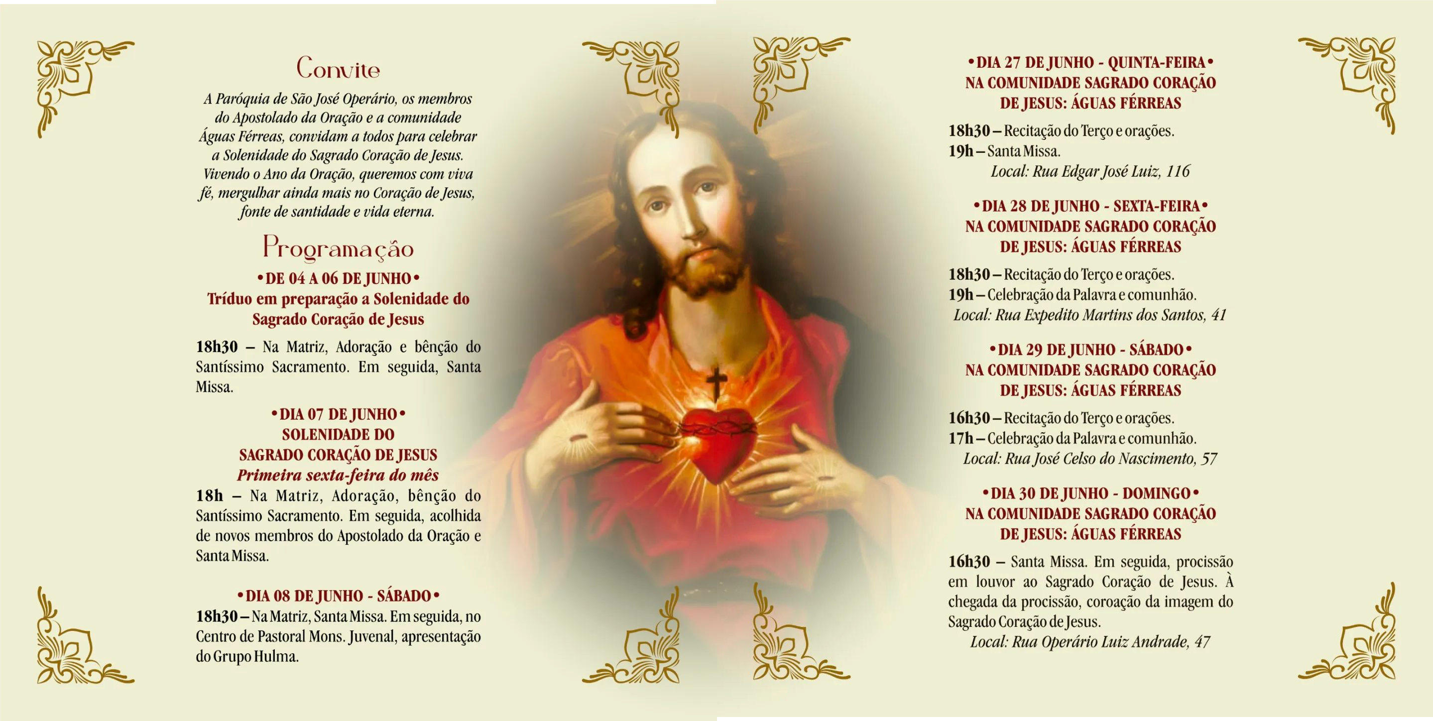 A Paróquia de São José Operário, os membros do Apostolado da Oração e a comunidade Águas Férreas, convidam a todos para celebrar a Solenidade do Sagrado Coração de Jesus. Vivendo o Ano da Oração, a comunidade paroquial deseja, com viva fé, mergulhar ainda mais no Coração de Jesus, fonte de santidade e vida eterna. A programação teve início na última terça-feira, 04, e segue até o último dia do mês, dia 30.