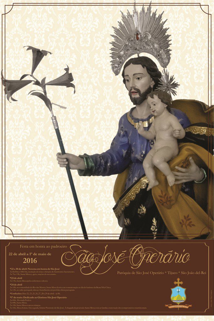 Padroeiro da Paróquia no bairro Tijuco, em São João del-Rei. São José Operário será festejado a partir do dia 22, com novena preparatória. Confira a programação: