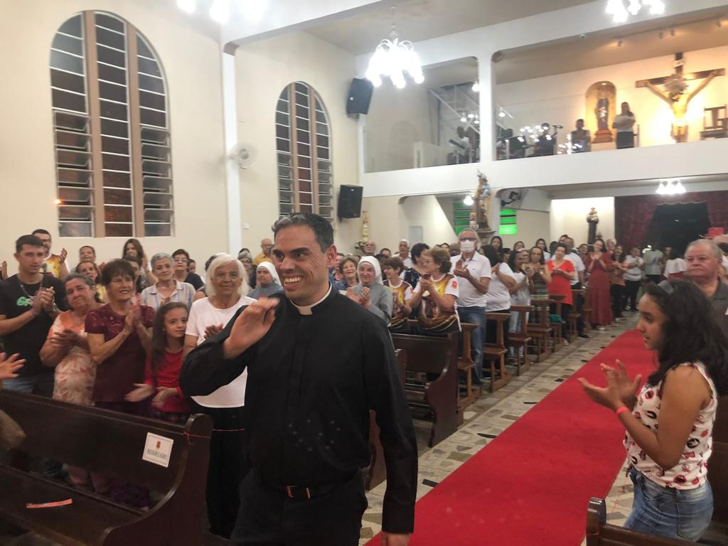 Ao final da missa, após a homenagem da comunidade, o padre realizou o discurso de agradecimento. ”Depois de uma cerimônia rica em símbolos e significados que expressa nossa fé e a responsabilidade de ser Igreja, me apresento como pastor dessa comunidade em comunhão plena com o pastor da nossa Diocese, nosso bispo. Juntos, sob o olhar de Maria, caminharemos ao encontro de Cristo”, pontuou o recém empossado.