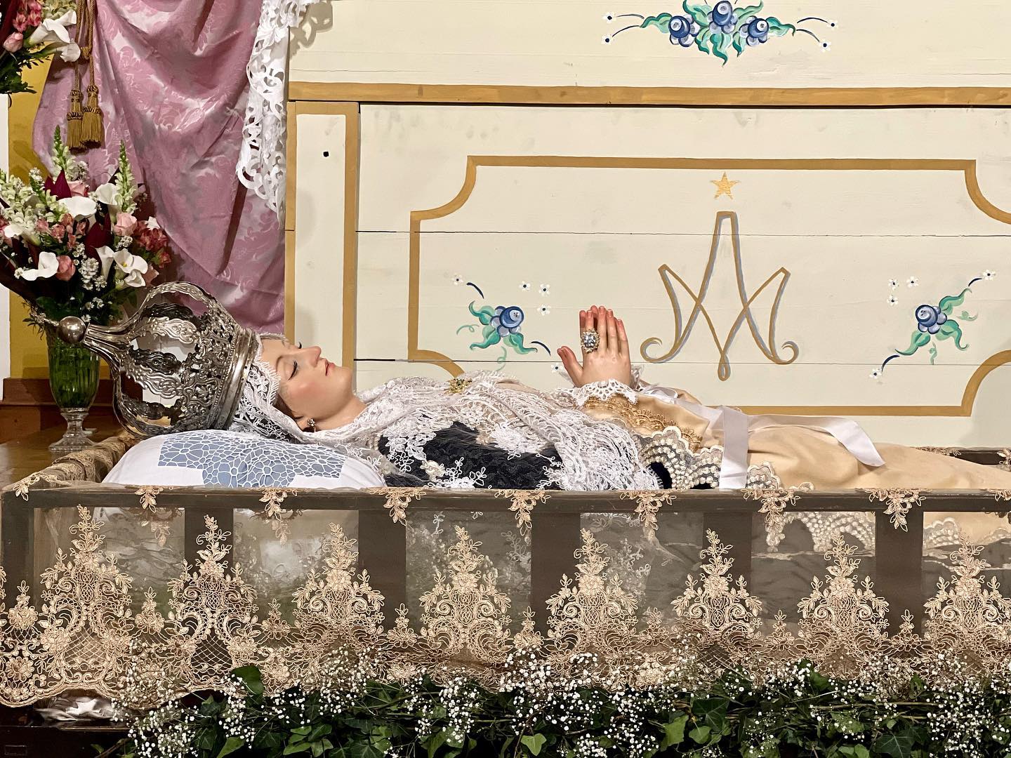 Segundo o Dogma mariano da Igreja Católica, proclamado em meados do século XX, Maria está viva e ressuscitada junto da Santíssima Trindade. Na comunhão dos santos, Nossa Senhora intercede por todos, seus devotos. Após realizar o projeto de Deus com disponibilidade e perseverança, ela foi glorificada de forma total, sendo elevada aos céus por anjos: Assunção.