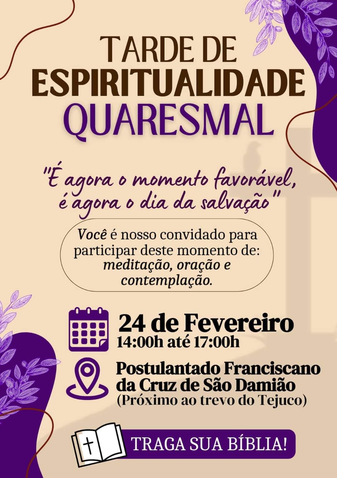 O período quaresmal se torna propício para momentos de reflexão pessoal e análise na caminhada de fé. Sendo assim, muitos grupos realizam encontros e retiros para possibilitar tais espaços. É pensando assim que as Paróquias São José Operário e São Francisco de Assis vão realizar neste sábado, 24, no Postulantado Franciscano da Cruz de São Damião, uma tarde de espiritualidade quaresmal para os leigos e leigas que desejam se retirar e aprofundar na fé neste tempo propício do Ano Litúrgico.