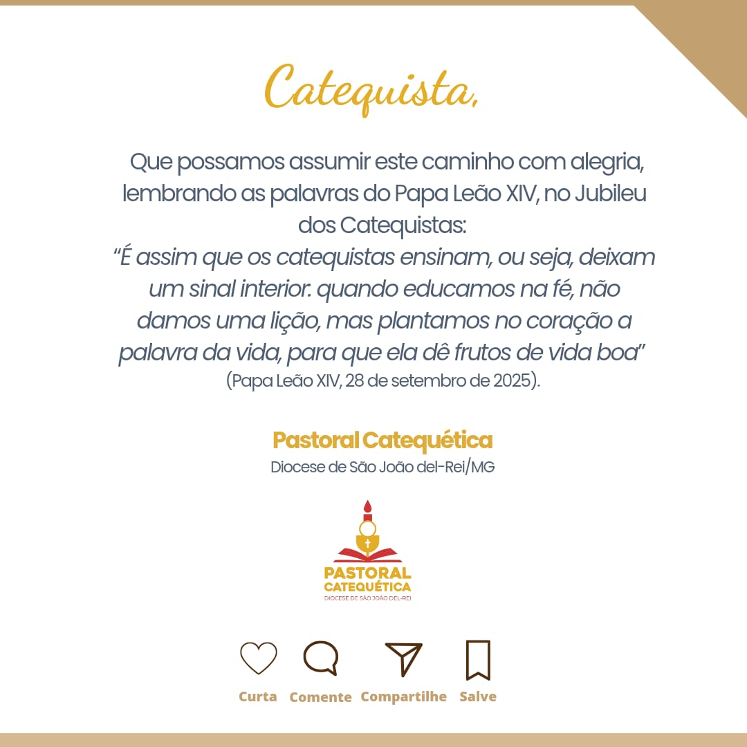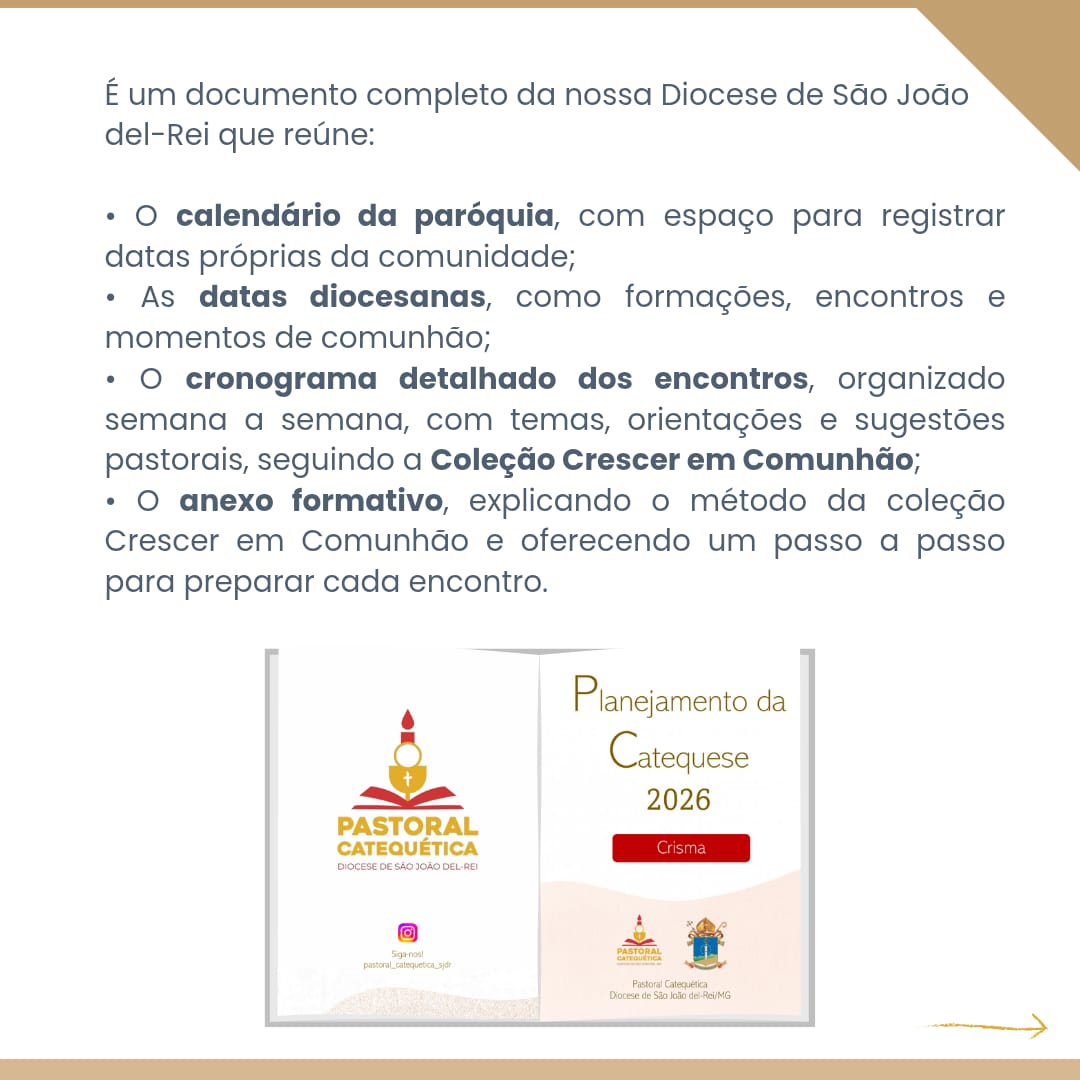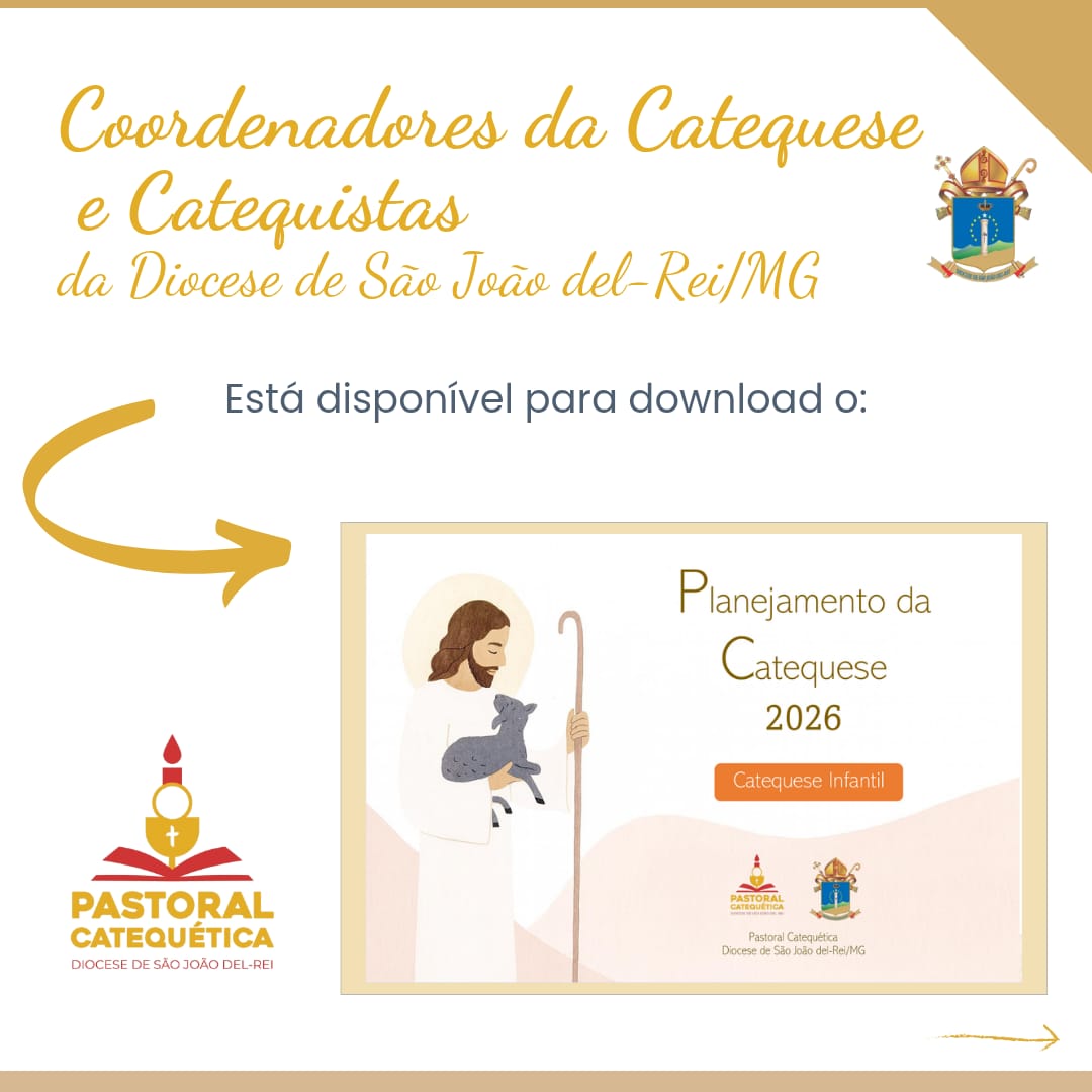 A Pastoral Catequética da Diocese de São João del-Rei, para organizar as atividades para o próximo ano, disponibilizou em suas redes sociais o material de planejamento 2026 que tem a finalidade de auxiliar na organização da Catequese nas respectivas comunidades paroquiais. O material ainda oferece, a cada mês do ano, sugestões para enriquecer ainda mais o caminho da Iniciação Cristã, no qual, o vocacionado(a), coopera com presteza e alegria no coração da Igreja.