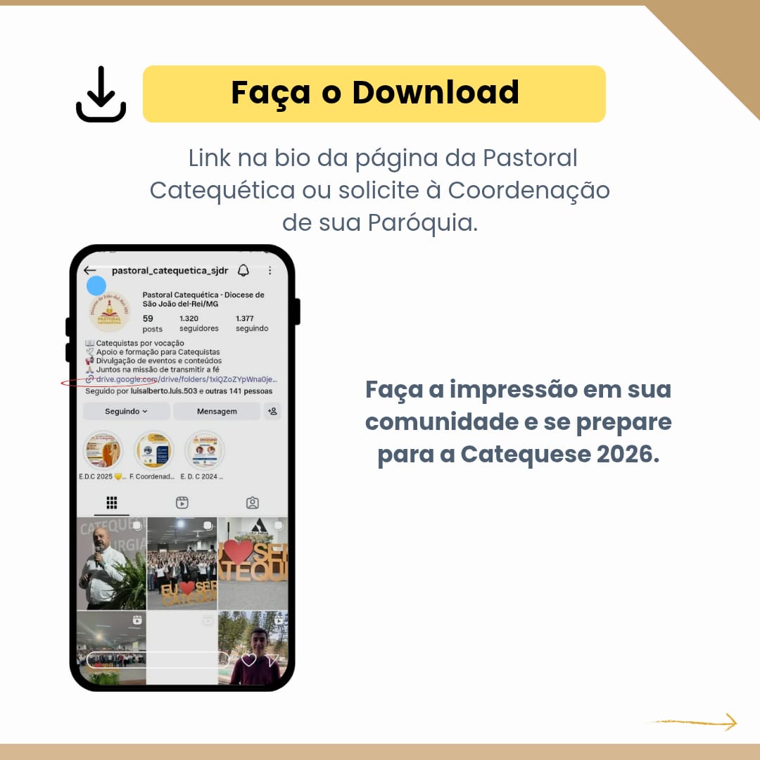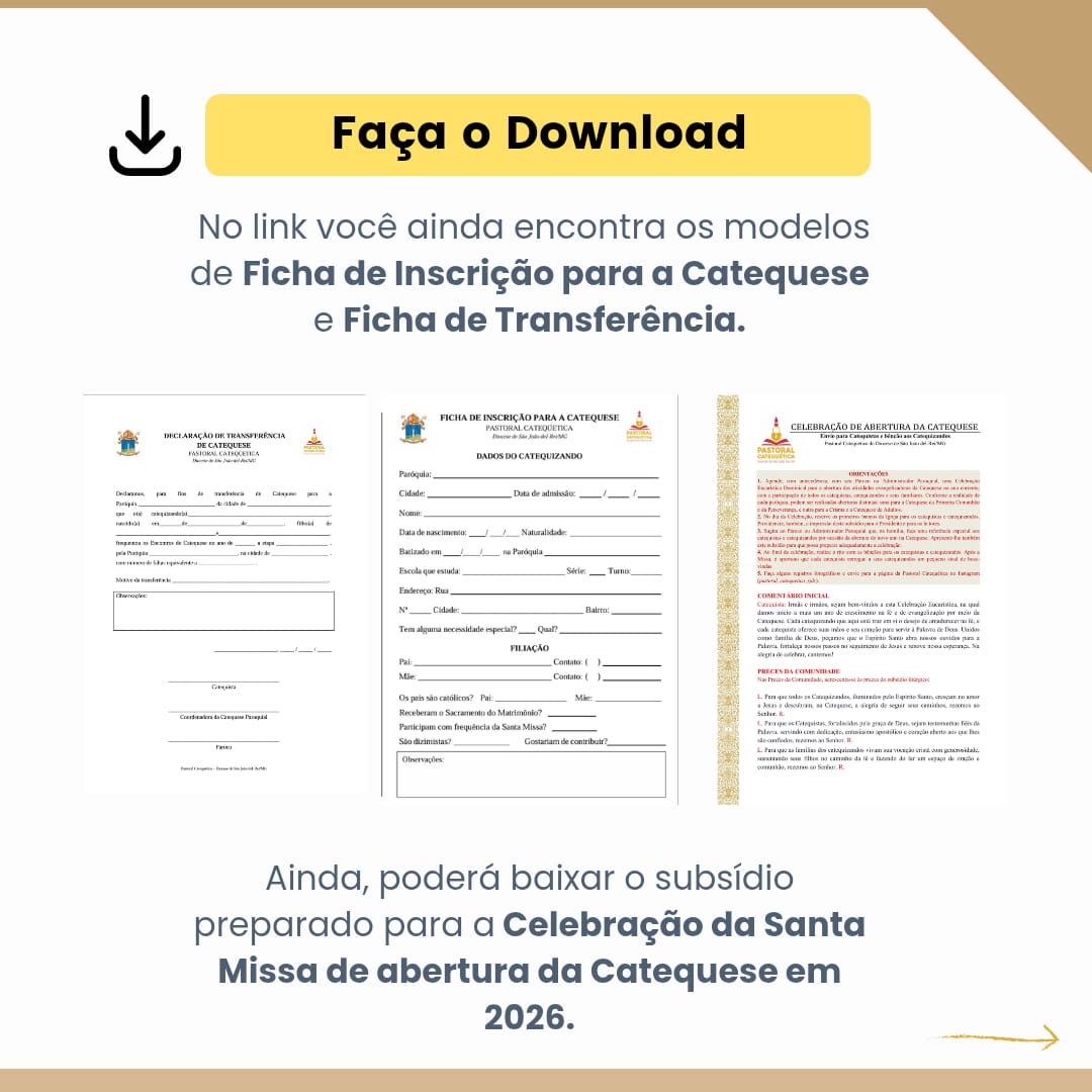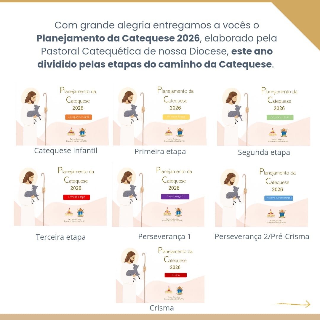 Com grande alegria entregamos a vocês o Planejamento da Catequese 2026, elaborado pela Pastoral Catequética de nossa Diocese, este ano dividido pelas etapas do caminho da Catequese. Este material será o nosso instrumento orientador ao longo de todo o ano, ajudando-nos a caminhar com comunhão, profundidade e espírito missionário na evangelização daqueles que iniciam sua jornada de fé. Importante recordar que você poderá ajustá-lo, no que diz respeito à disposição das datas, de acordo com a realidade de sua comunidade paroquial.