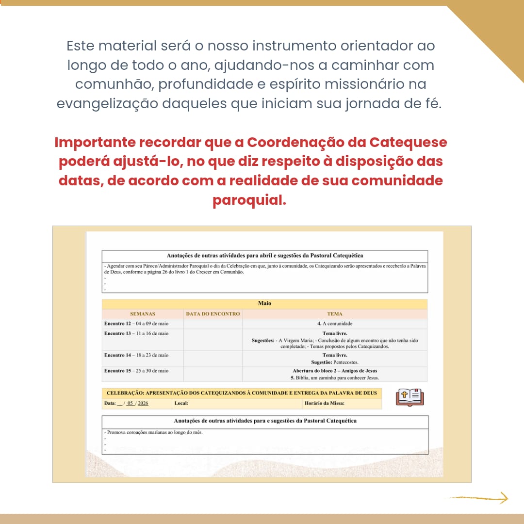 - O cronograma detalhado dos encontros, organizado semana a semana, com temas, orientações e sugestões pastorais, seguindo a Coleção Crescer
