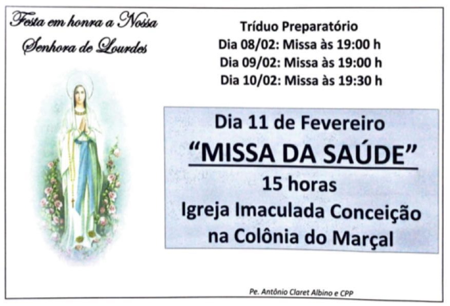 Para celebrar a data e festejar Nossa Senhora de Lourdes, a Pastoral da Saúde promove a partir desta quinta-feira, 08, o Tríduo Preparatório para a festa de Nossa Senhora de Lourdes, com missa especial para os enfermos no próximo domingo, dia 11.