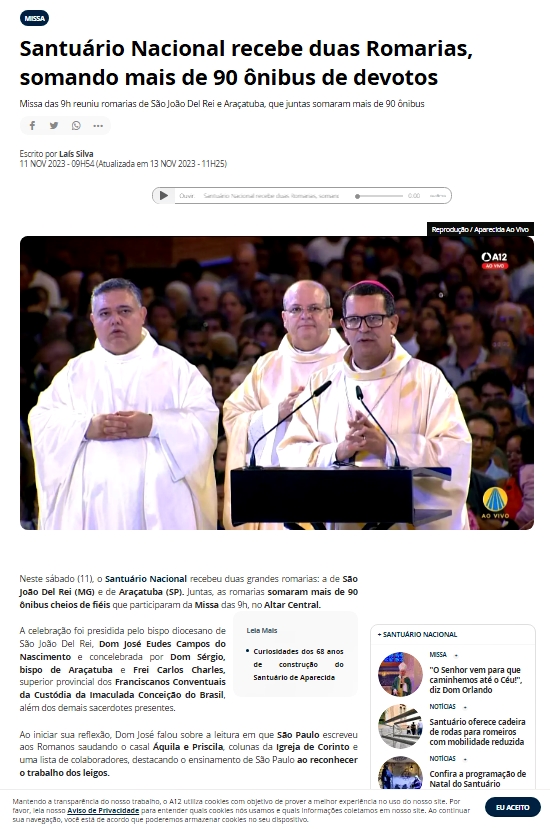 A grande participação da Romaria da Diocese de São João del-Rei na Santa missa do último sábado, 11, no Santuário Nacional de Aparecida ganhou destaque no Portal de Noticias oficiais do Santuário, o A12. A notícia foi atualizada na manhã da última segunda-feira, 13, e falou sobre a participação dos leigos, clero e do bispo diocesano, Dom José Eudes Campos do nascimento, que presidiu a celebração.