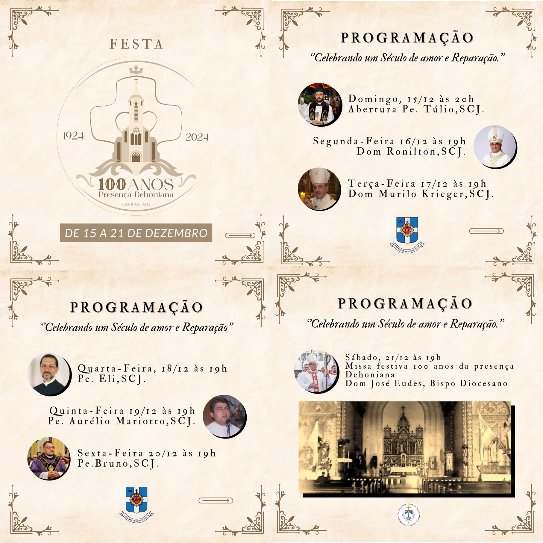 O lema das comemorações é “Celebrando um século de amor e Reparação” e busca refletir a longa história de dedicação e serviços dos padres dehonianos na cidade, destacando a essência do carisma semeado ao longo desses anos.
