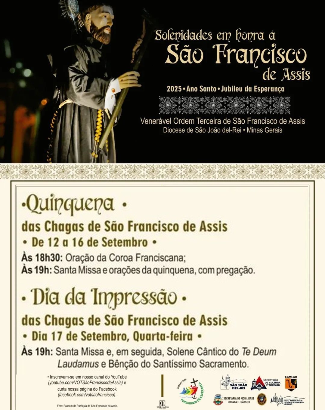Tem início nesta sexta-feira, 12, em São João del-Rei, a Quinquena em honra a São Francisco de Assis. Composto por 05 dias de oração em preparação dos estigmas do santo, o rito abre as festividades na paróquia e é seguido por novenário. Aclamado como pai dos pobres, a festa é promovida pelos religiosos franciscanos e pelos membros da Ordem Terceira.