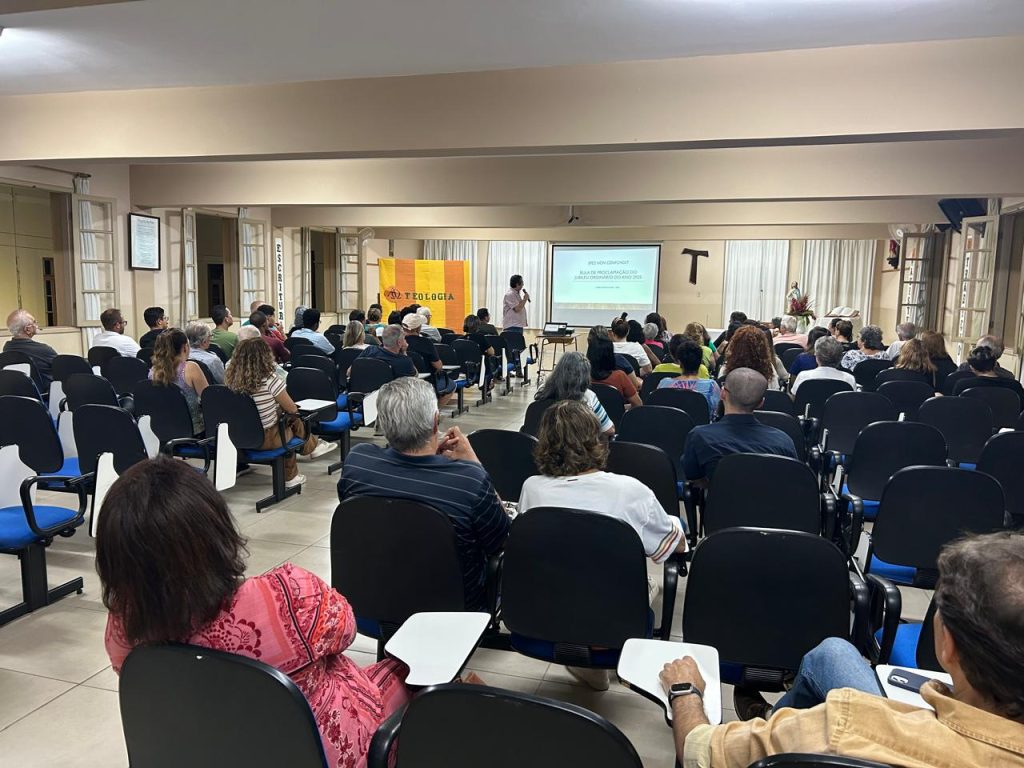 Um auditório lotado ouviu atentamente frei Jonas Nogueira discorrendo com muita sabedoria sobre Esperança, Misericórdia e o Jubileu de 2025 na Aula Inaugural da 13ª Turma do Curso Básico de Teologia. O evento aconteceu na noite desta segunda-feira, 03 de fevereiro, e contou, ainda, com a participação dos postulantes franciscanos que receberam os participantes com a beleza do canto e a oração inicial.