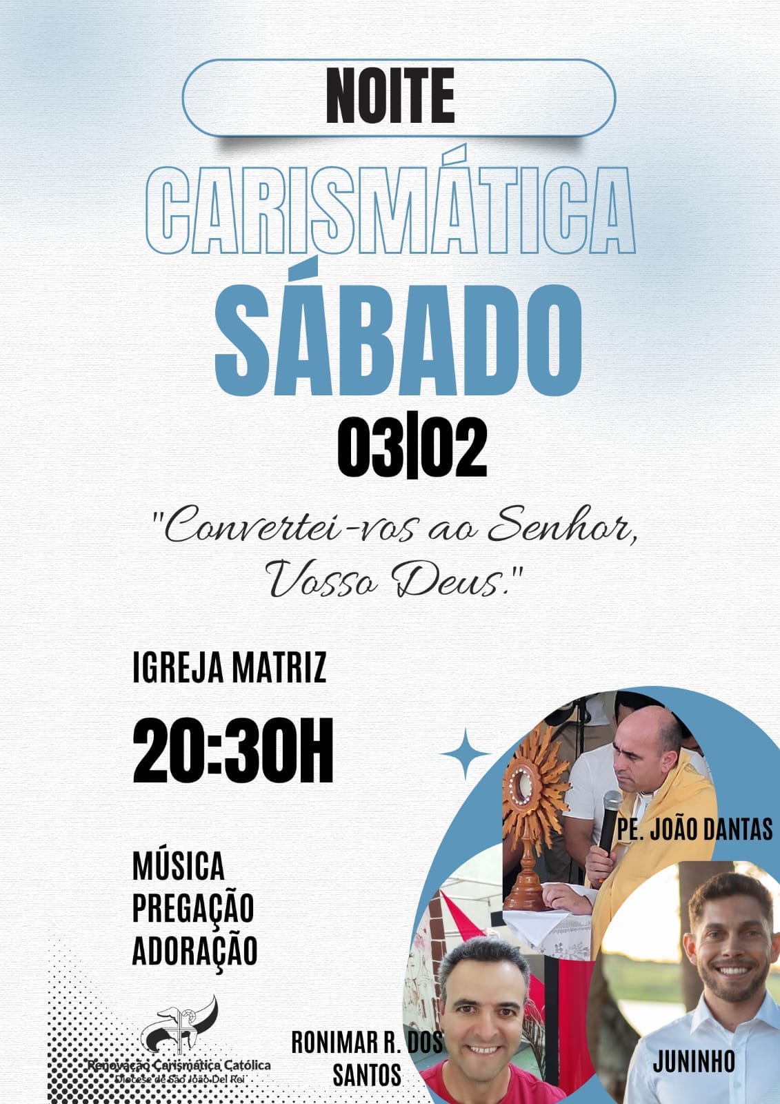 Uma noite de muita oração, louvor e bênçãos deve marcar o próximo sábado, dia 03, na Paróquia São Vicente Ferrer, na cidade de São Vicente de Minas. O evento, promovido pela Renovação Carismática Católica (RCC) vai acontecer na igreja matriz, à partir das 20h30.