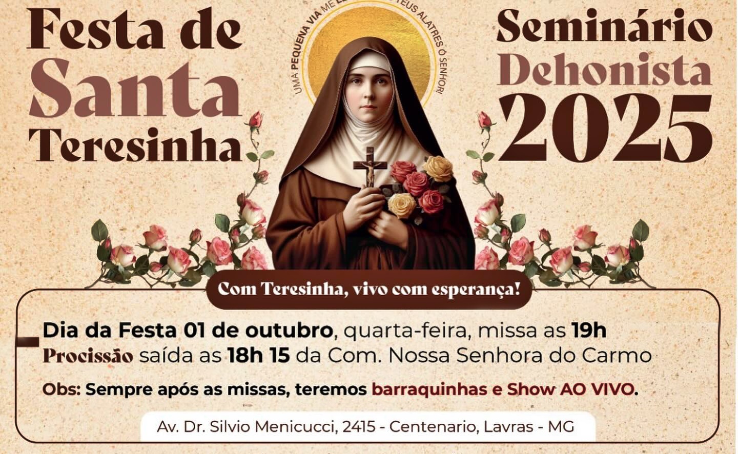 O Seminário Dehonista, em Lavras, celebra nesta quarta-feira, 01º, a memória da Padroeira das Missão, Santa Teresinha do Menino Jesus. A festa já é tradição na casa de formação e atraí anualmente a atenção de dezenas de fiéis e devotos para a Missa devocional à santa carmelita. Muitos recorrem a intercessão da santa, trazendo pedidos e agradecendo graças recebidas.