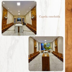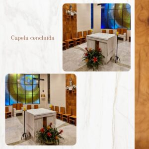 O projeto de adequação litúrgica da capela foi desenvolvido pelo Pe. Rutiero Carvalho, especialista em arquitetura sacra. O objetivo foi valorizar a dinâmica celebrativa, alinhando os polos que expressam a unidade da ação litúrgica.