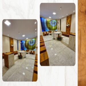 O altar, o ambão e a sede foram confeccionados em mármore Michelangelo Nuvolato e madeira Peroba Rosa. O altar apresenta um belo trabalho de marchetaria, simbolizando as águas que fluem do templo (Ez 47) e “do trono de Deus e do Cordeiro” (Ap 22), continuando-se no desenho do piso. O ambão expressa que a Palavra proclamada é “caminho, verdade e vida” para os fiéis.
